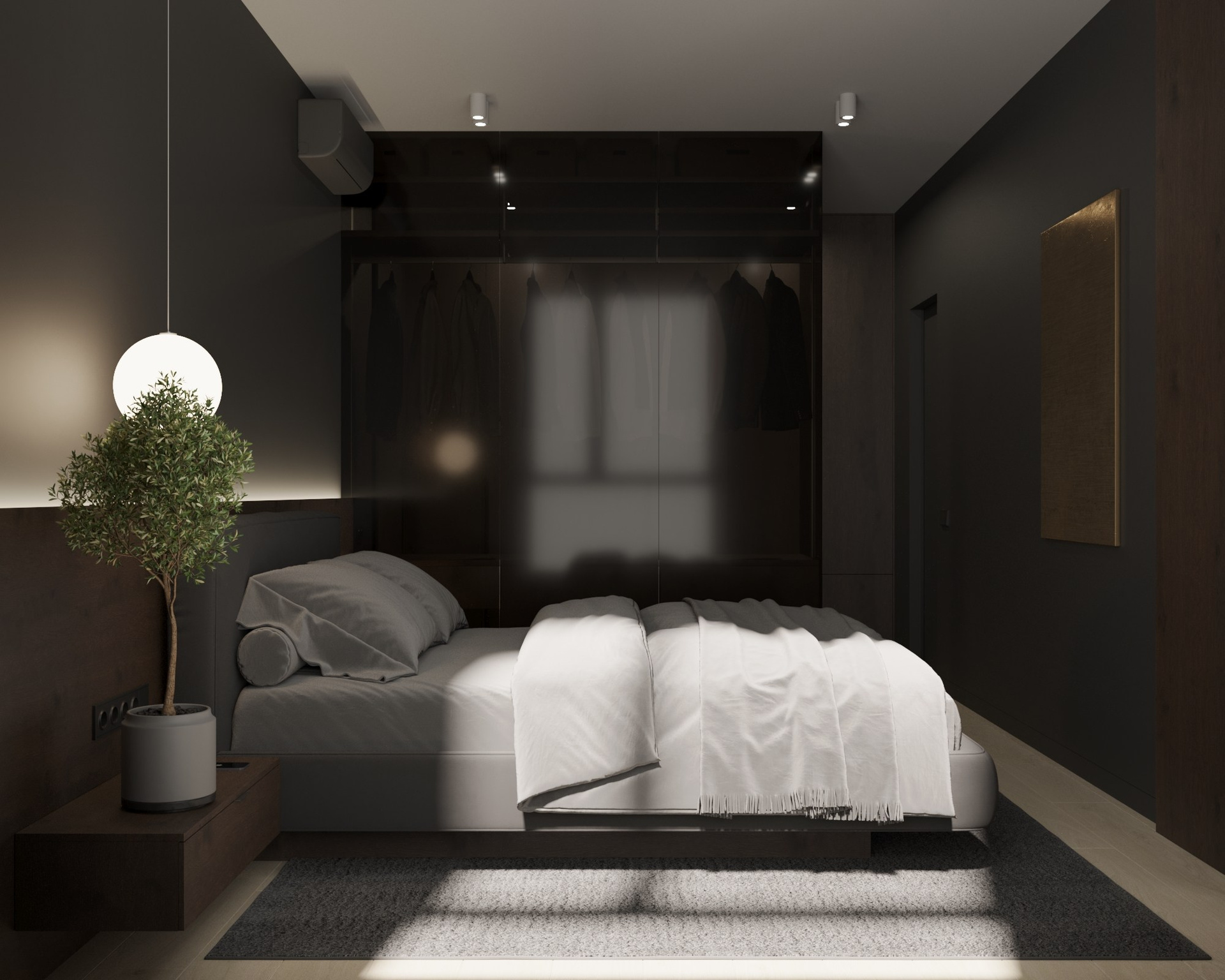 The main highlight of this project is the bathroom. The customer wanted something accentuated in this room, but was afraid that he would get bored quickly. So we offered him the solution of a monochrome bathroom with RGB light cloth. In this way, the neutral background can be adjusted to any colored lighting.