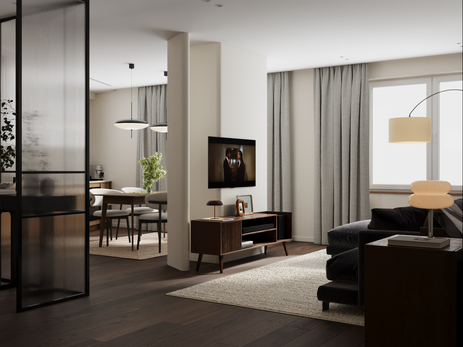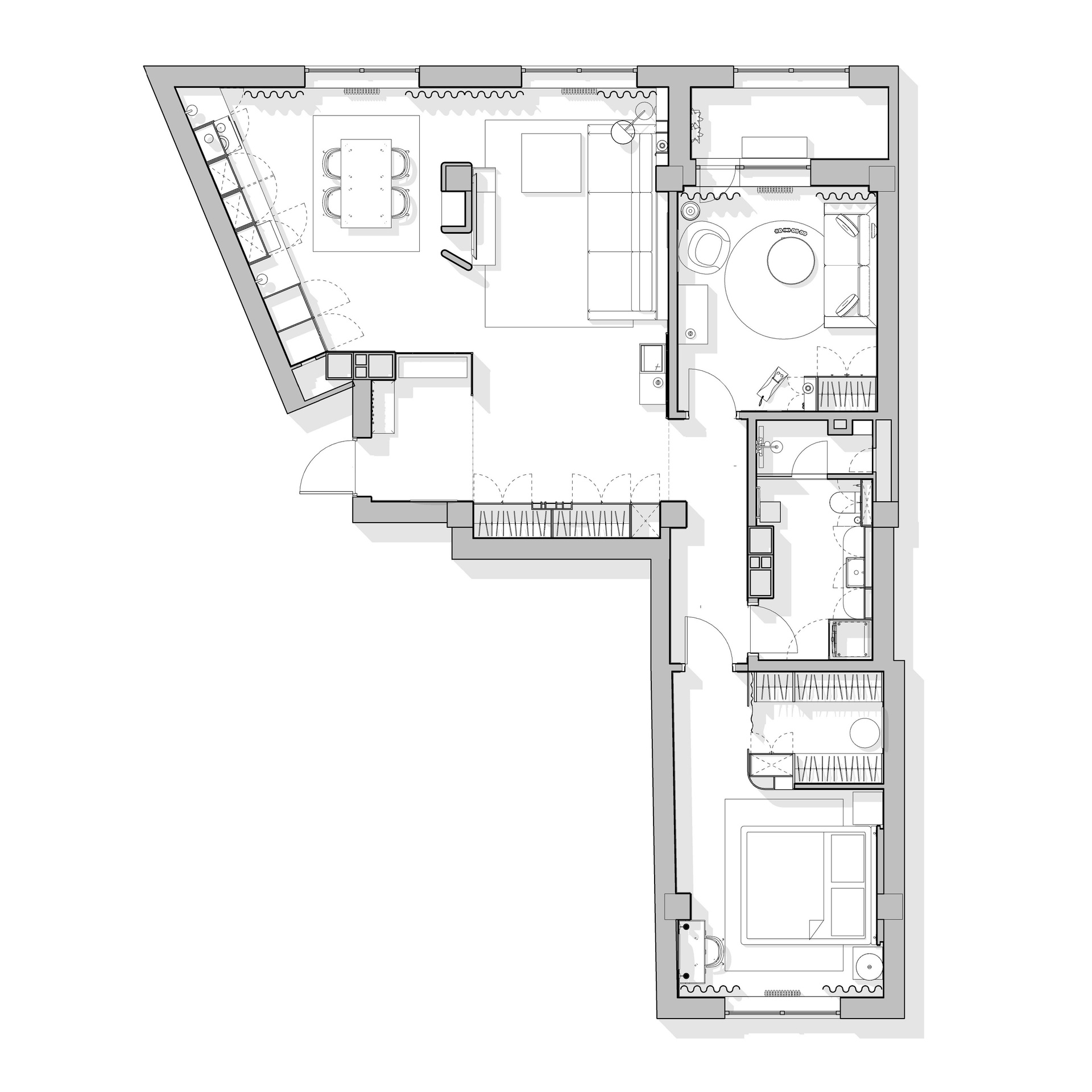 К нам обратилась молодая пара (и их четвероногий друг — полноценный участник процесса). Задача была амбициозная: стереть все следы ремонта нулевых, объединить кухню с гостиной, поменять местами спальню и кабинет и, конечно, добавить гардеробную — куда же без неё.