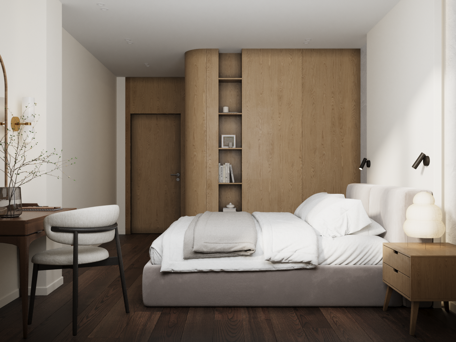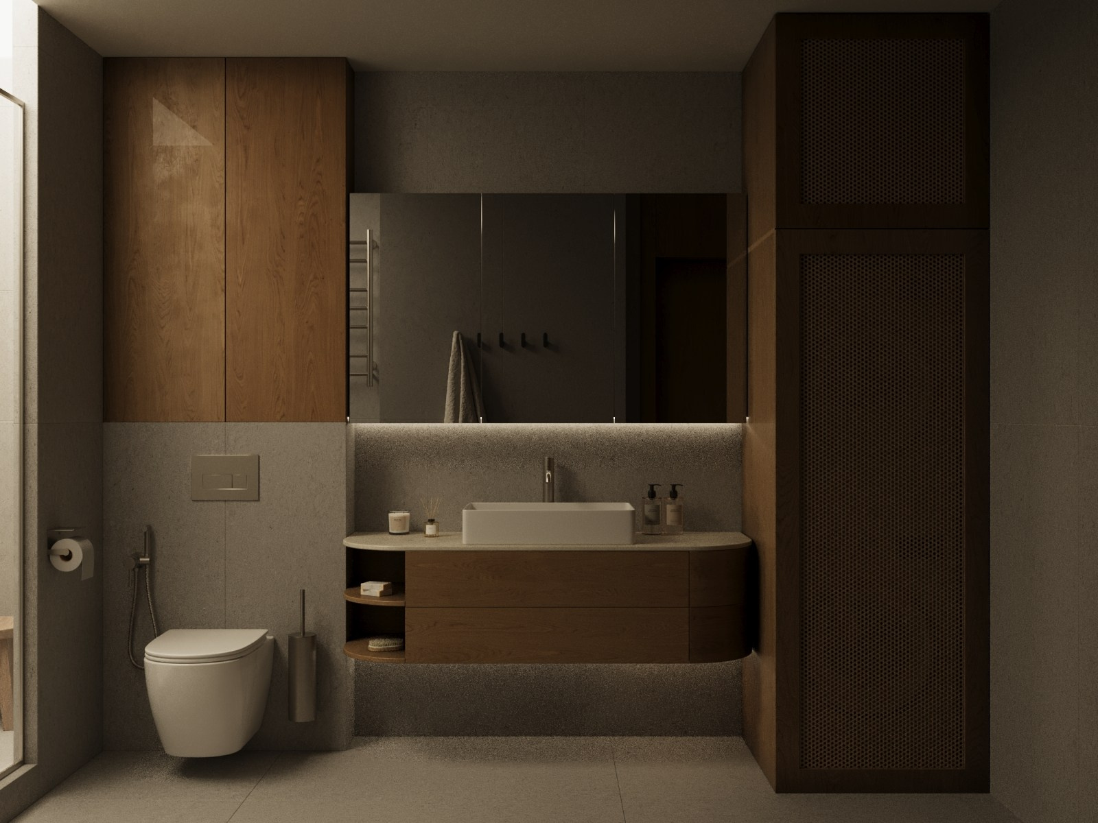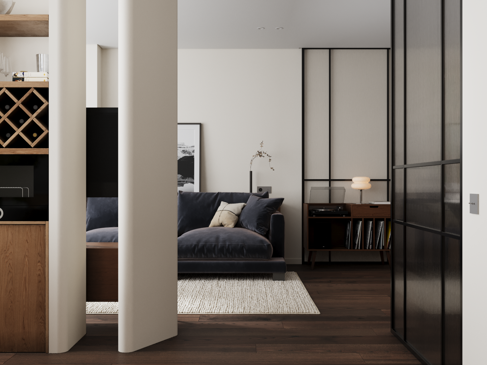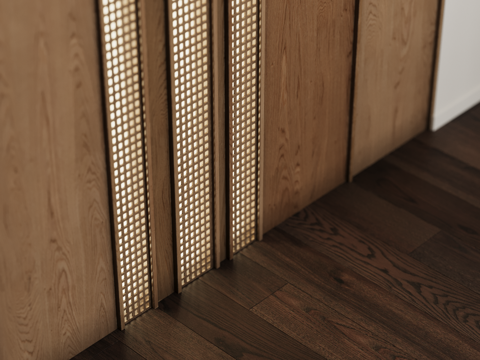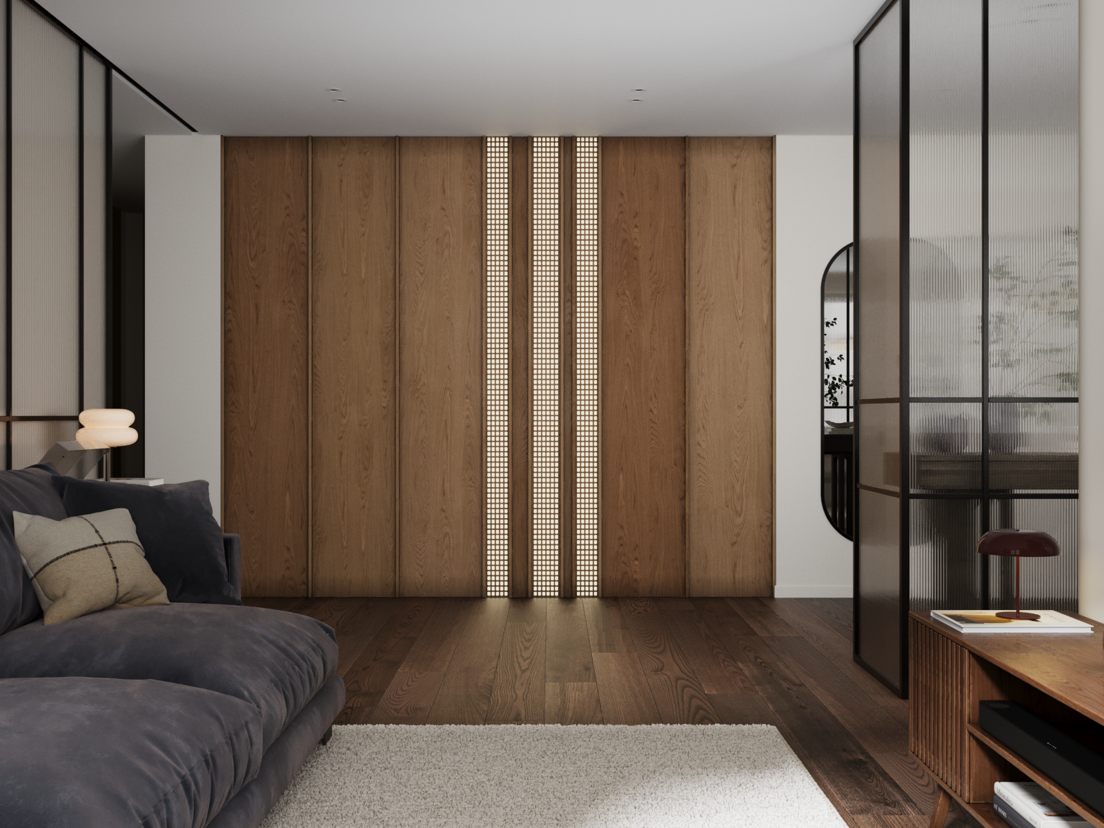 У заказчиков было вполне четкое виденье по стилю — спокойный, благородный интерьер с нотками джапанди и деталями мид-сенчури. В проекте большое количество деревянных поверхностей, и мы не старались увести их в 1-2 оттенка дерева. Считаем, что разные оттенки дерева смотрятся намного выигрышнее и логичнее.