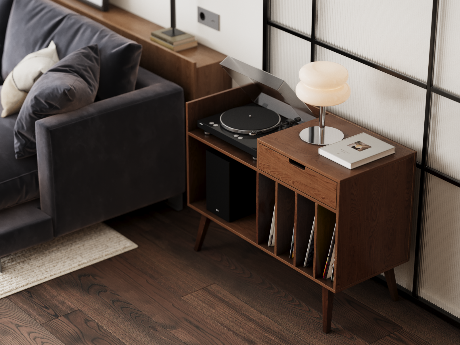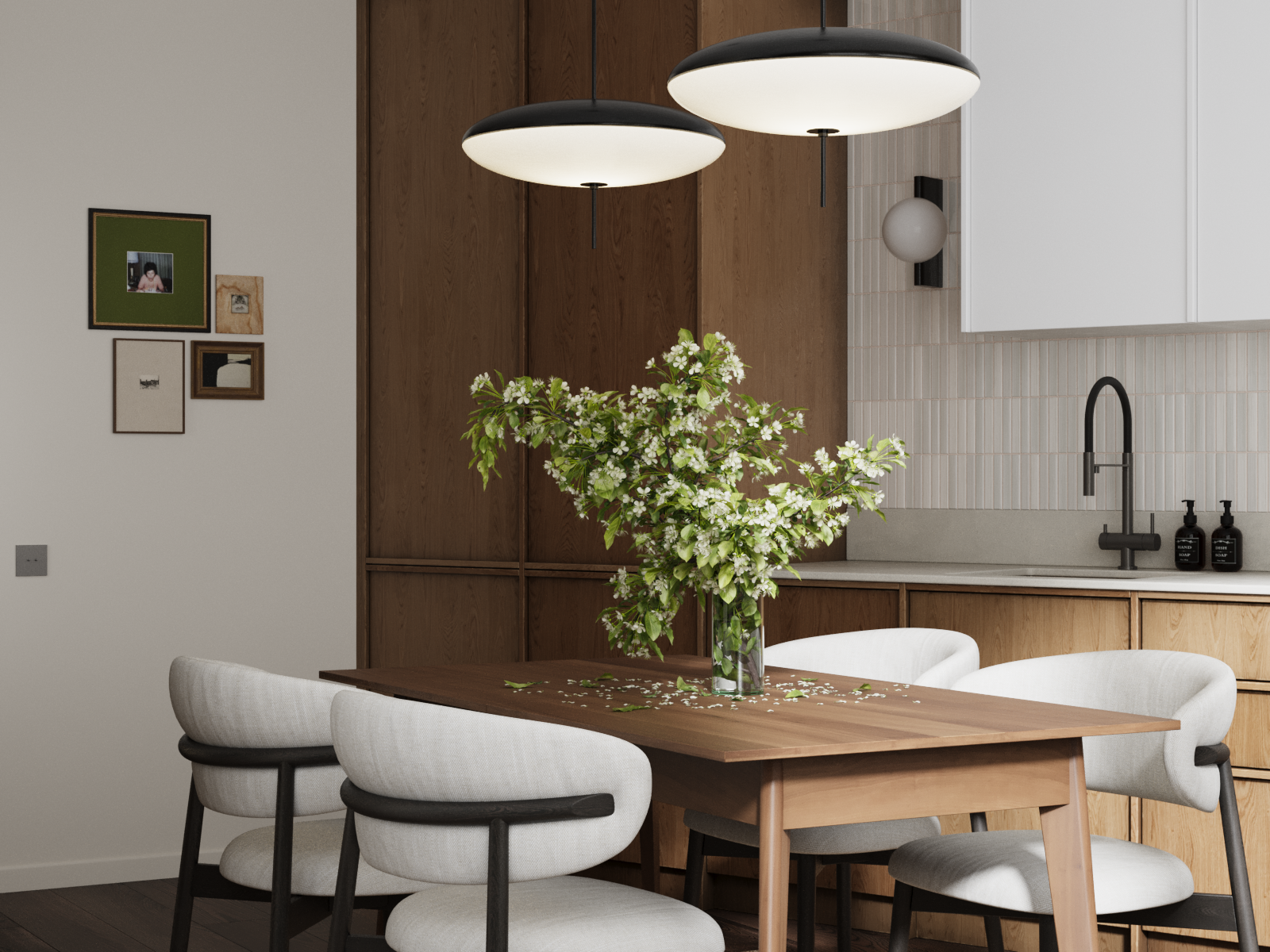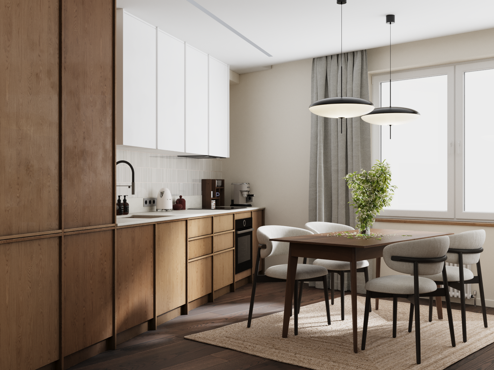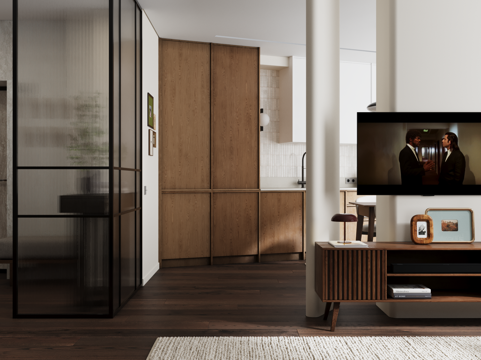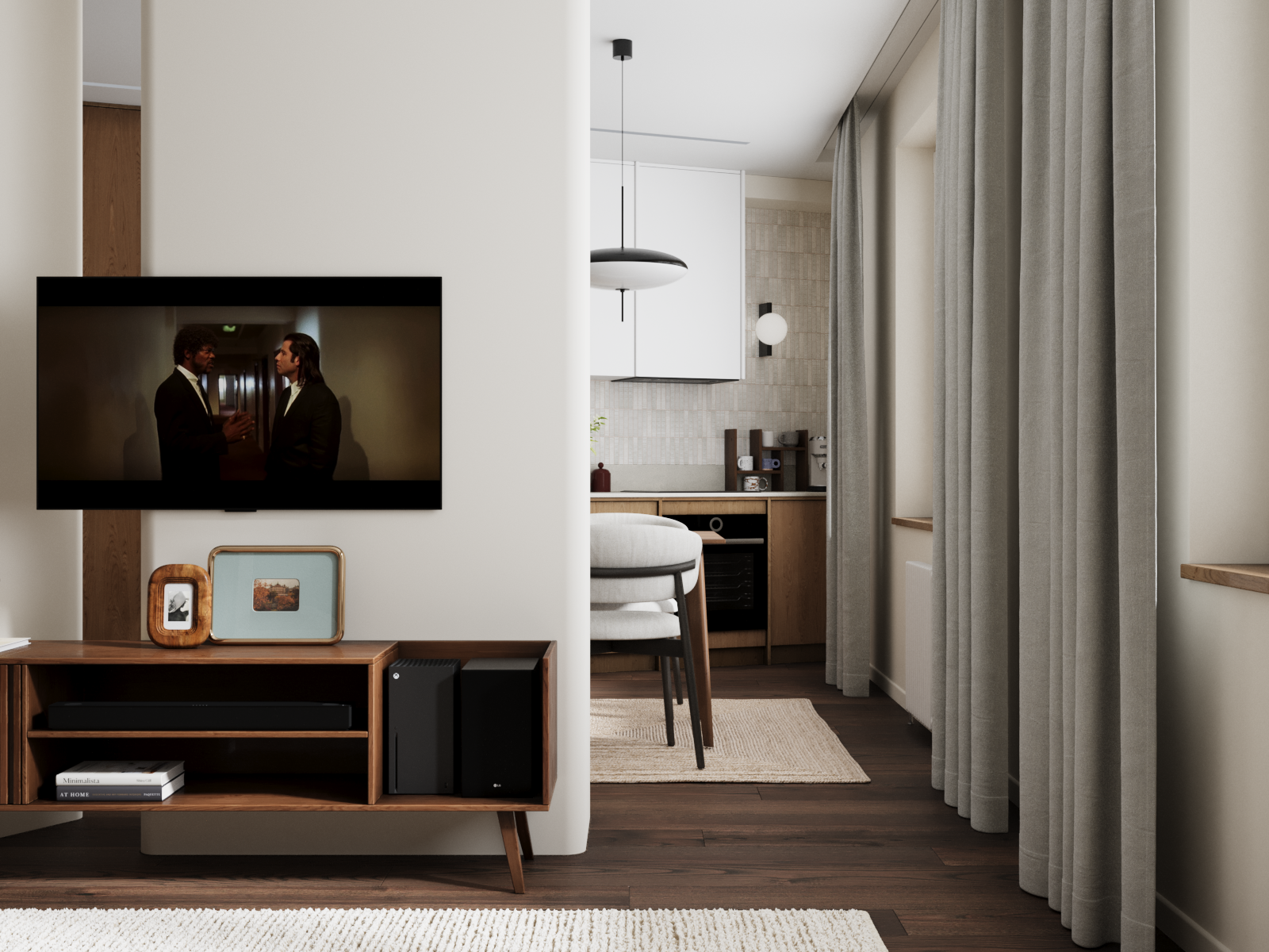 У заказчиков было вполне четкое виденье по стилю — спокойный, благородный интерьер с нотками джапанди и деталями мид-сенчури. В проекте большое количество деревянных поверхностей, и мы не старались увести их в 1-2 оттенка дерева. Считаем, что разные оттенки дерева смотрятся намного выигрышнее и логичнее.