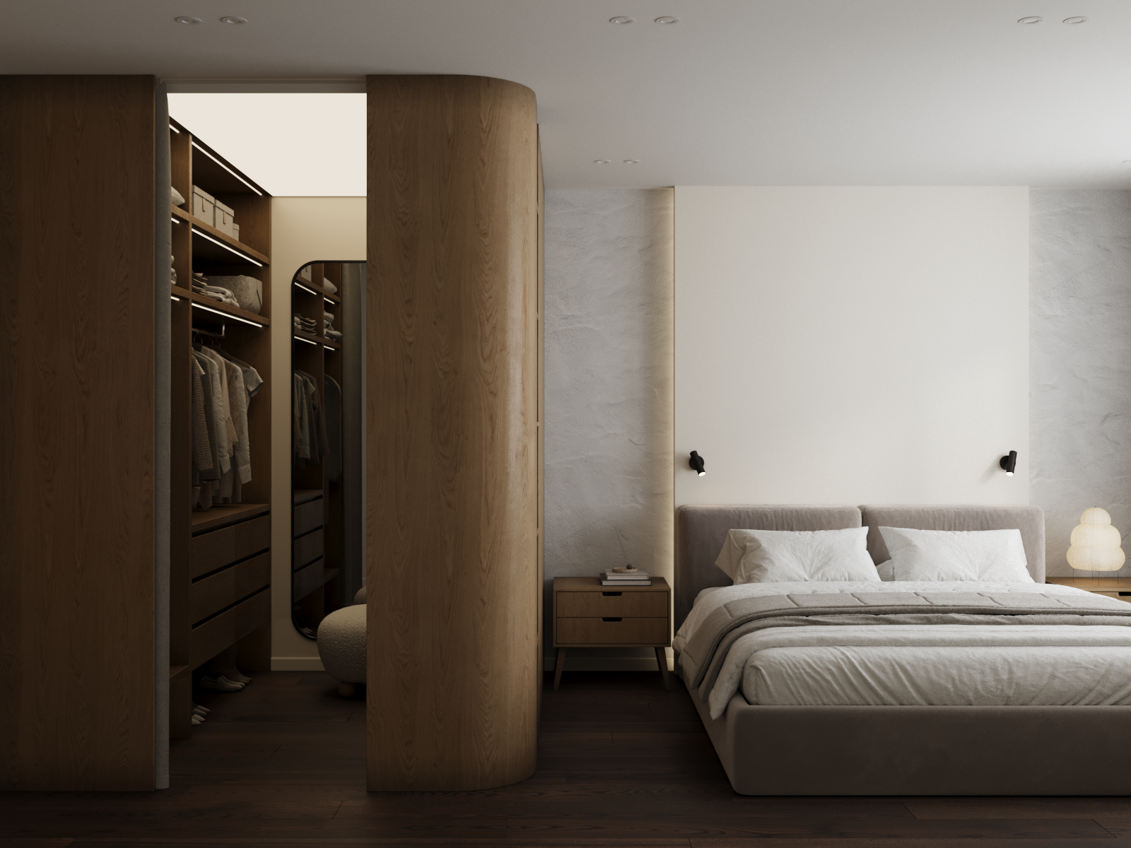В мастер спальне удалось размесить отдельную гардеробную в мебельном исполнении. Закругленный угол придает мягкости массивной конструкции, а также увеличивает перспективу обзора при входе в комнату, отсекая угол.