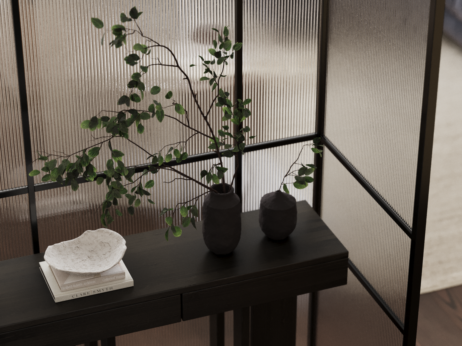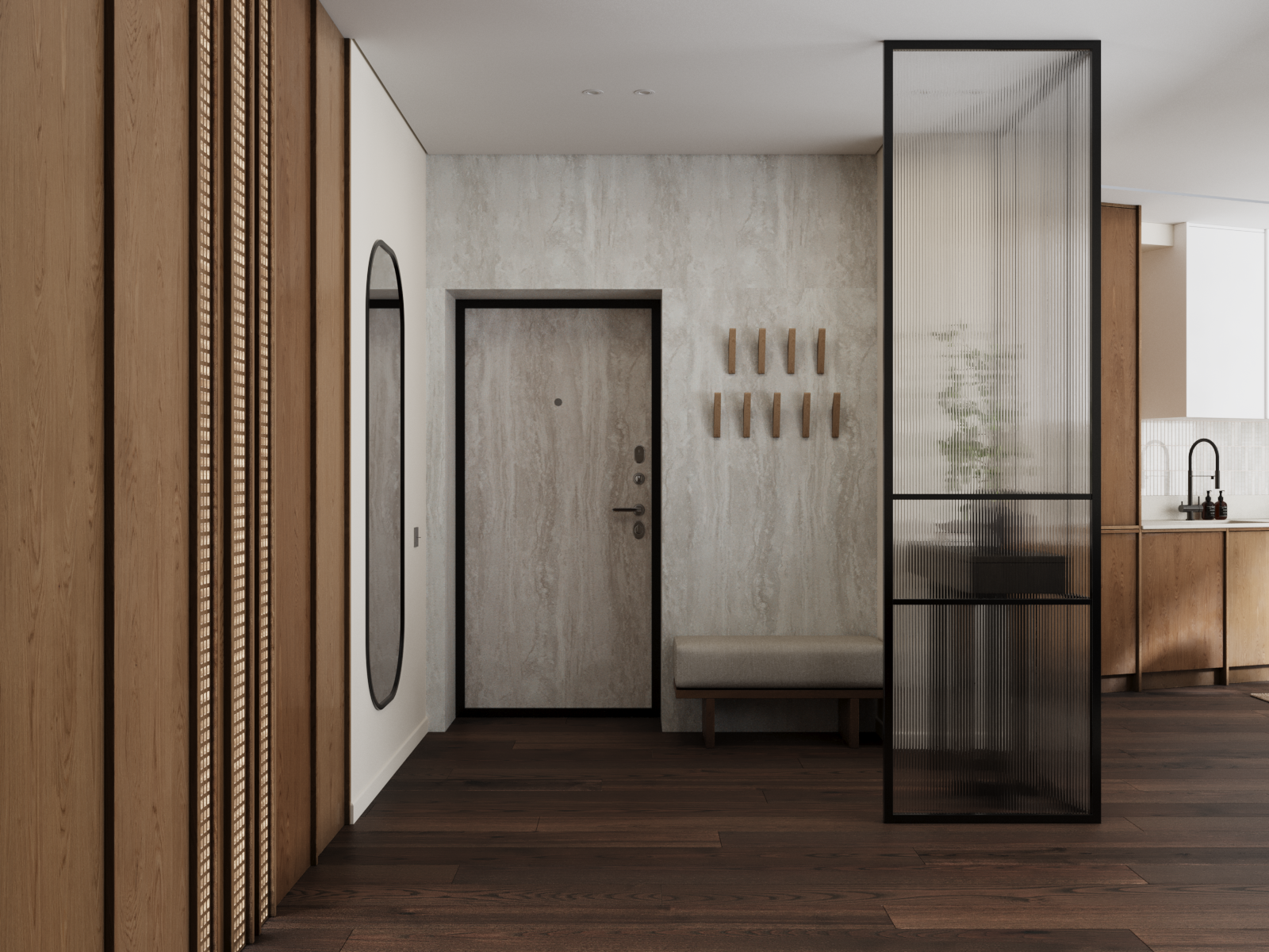 Прихожая отделена от кухни-гостиной стеклянной перегородкой с рифленым стеклом — в нее попадает свет, но сохраняется приватность от незнакомых людей (курьеров и т. д.).