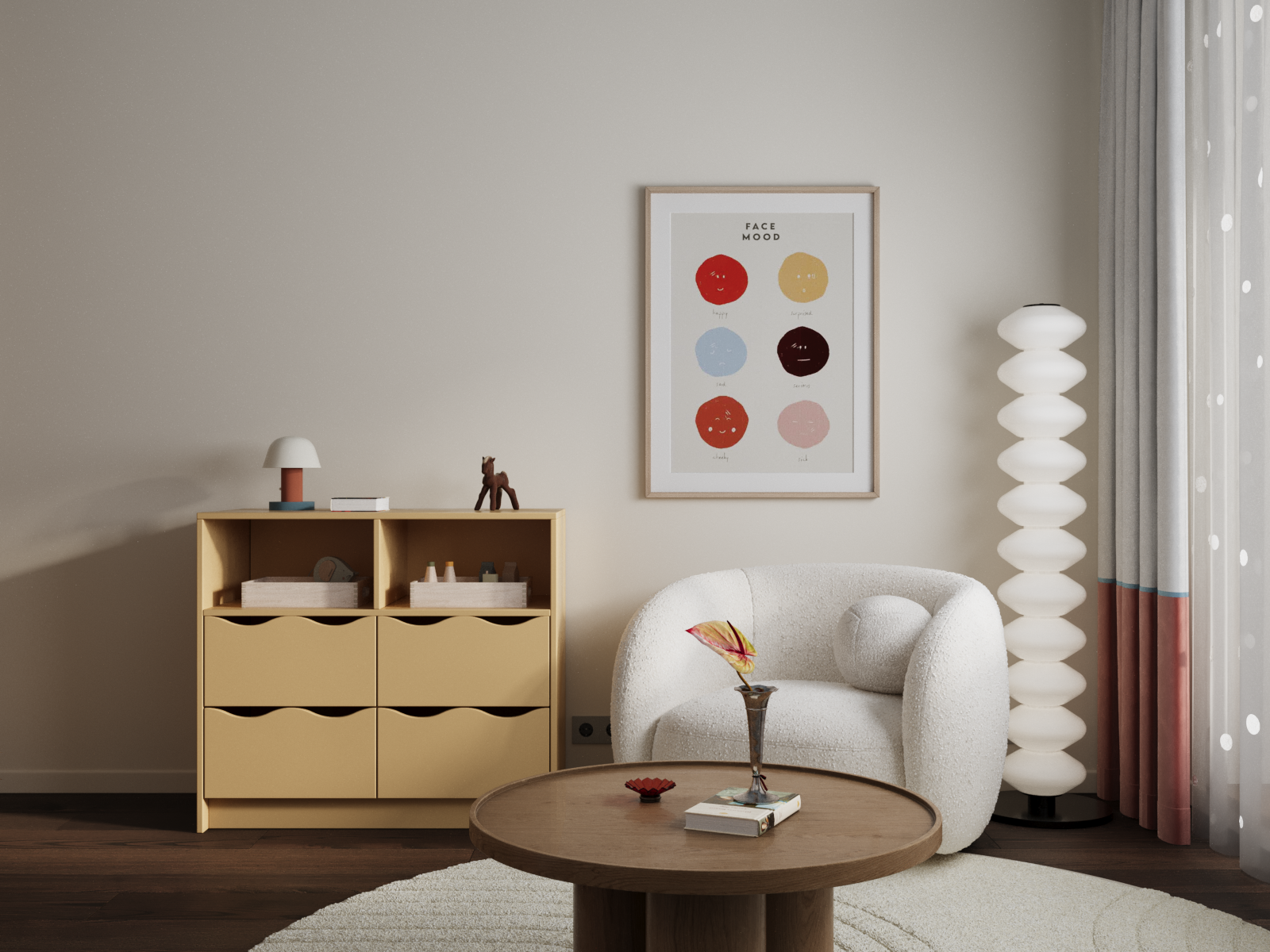 Детская комната изначально планировалась как кабинет, но жизнь внесла свои коррективы прямо в процессе разработки дизайн-проекта. Здесь мы позволили себе ввести активные цвета — нежный серо-голубой на потолке, напоминающий небо, теплый терракотовый и солнечные акценты. Заказчики хотели сохранить детскую комнату гендерно нейтральной.