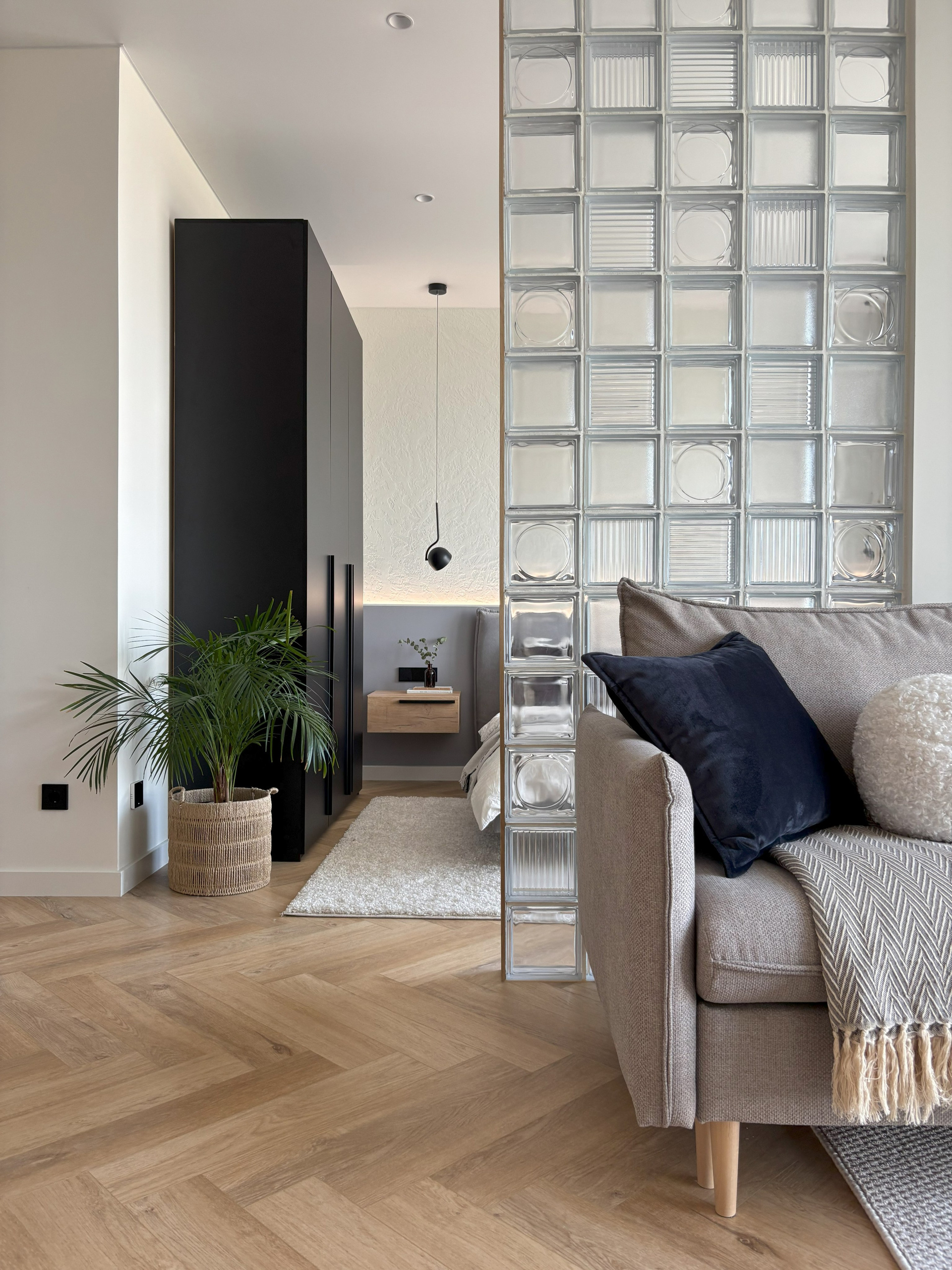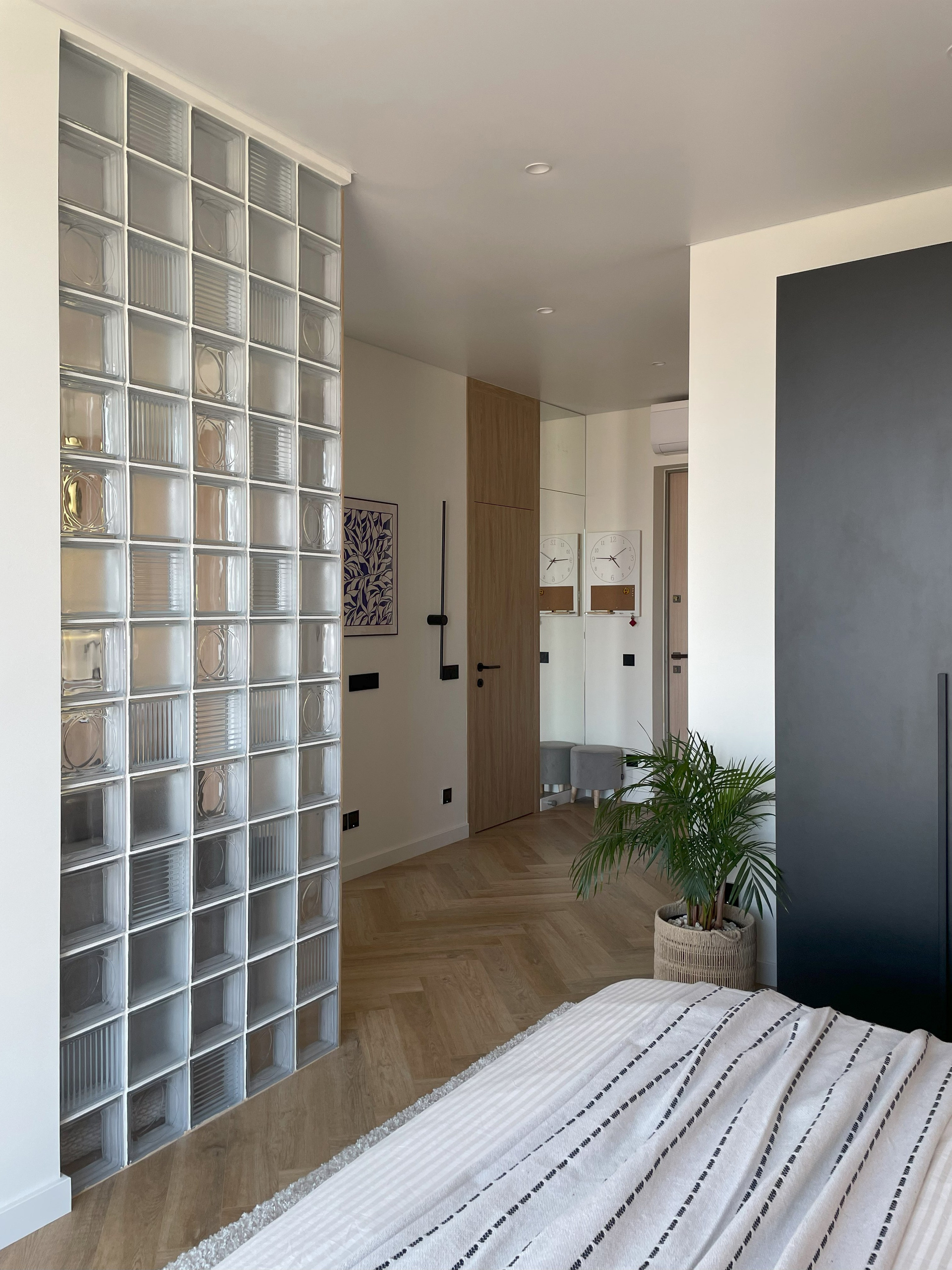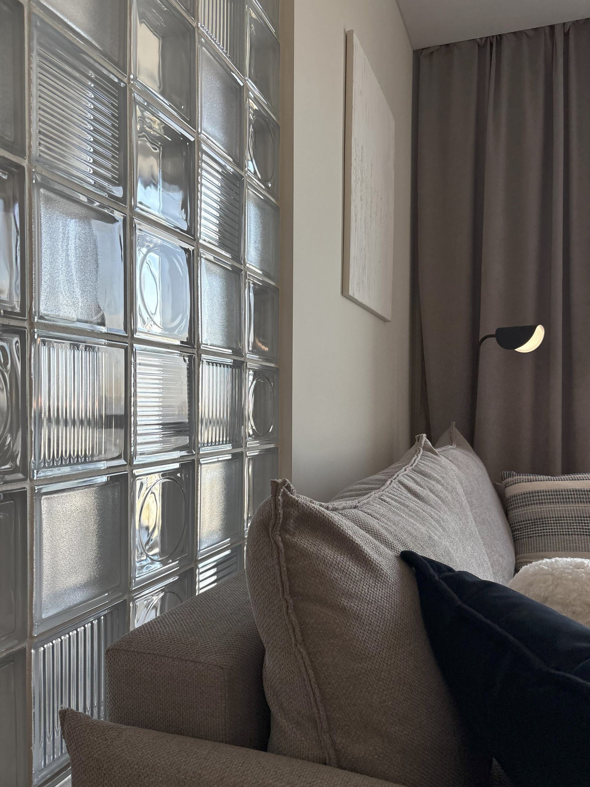 Зону гостиной и спальни изначально должны были разграничивать рейки. Но мы предложили заменить их на более актуальное решение — стеклоблоки. И остались в выигрыше: свет проникает, зоны визуально отделены, в центре студии появился арт-объект, ставший сердцем квартиры.