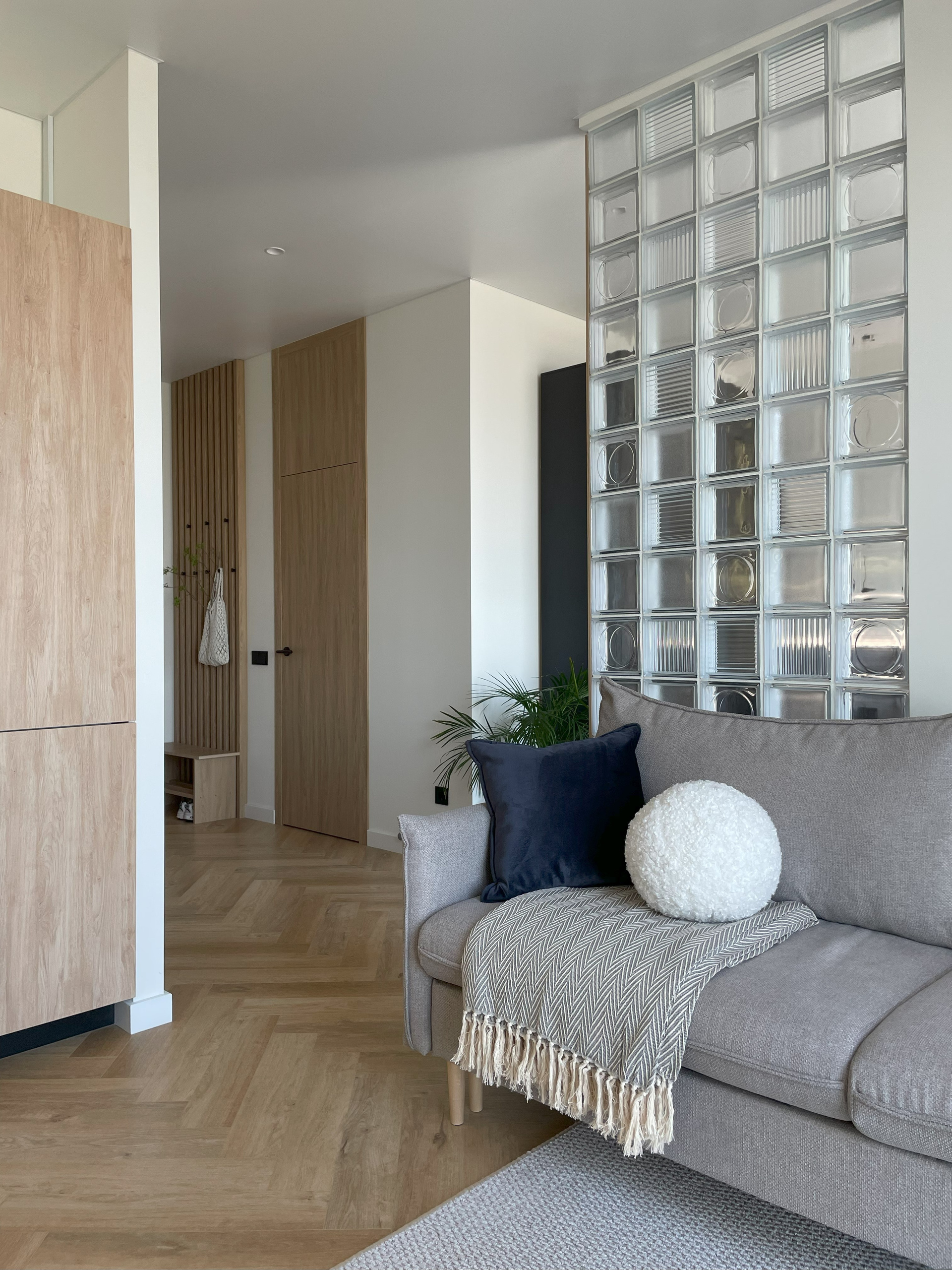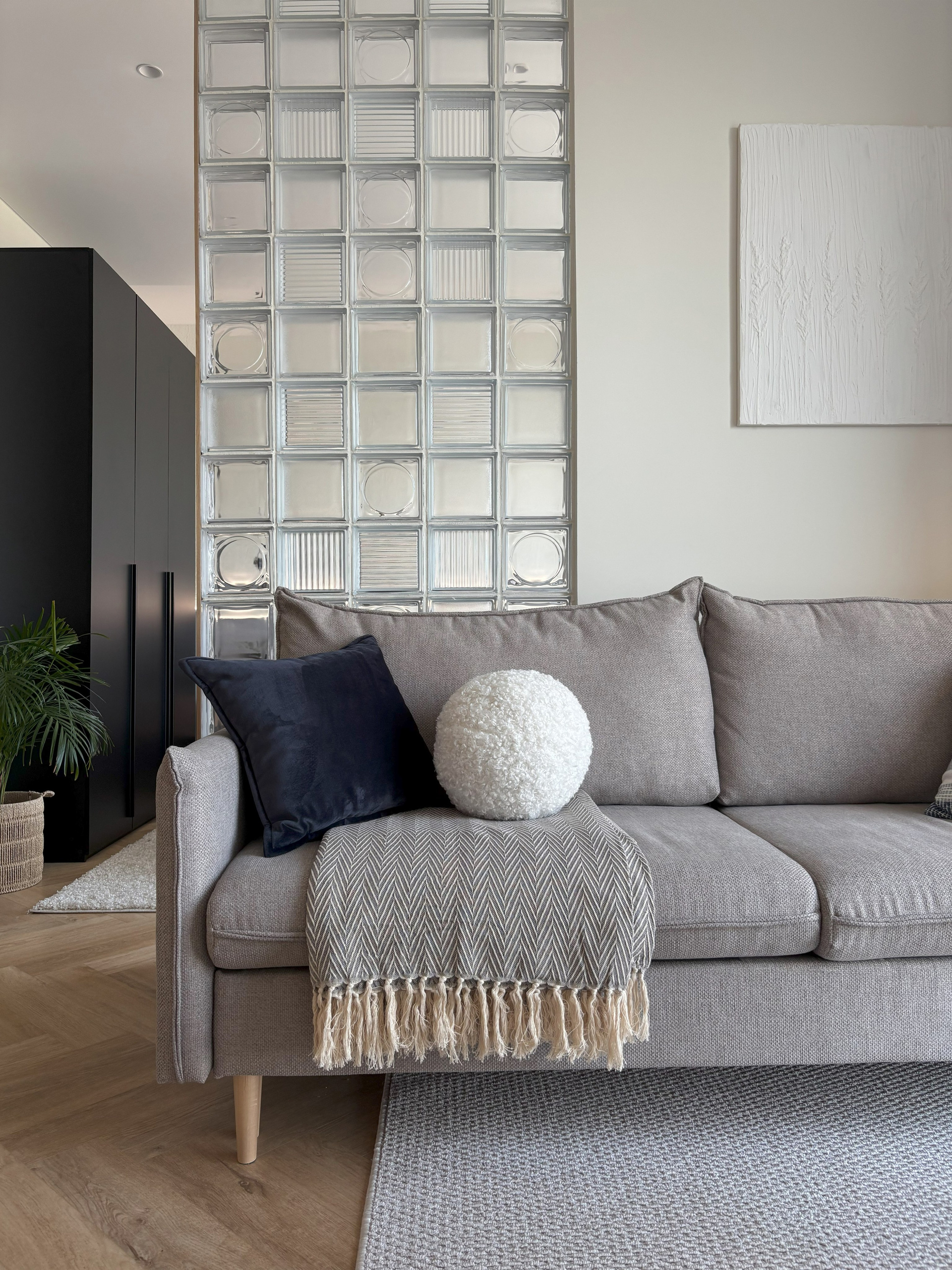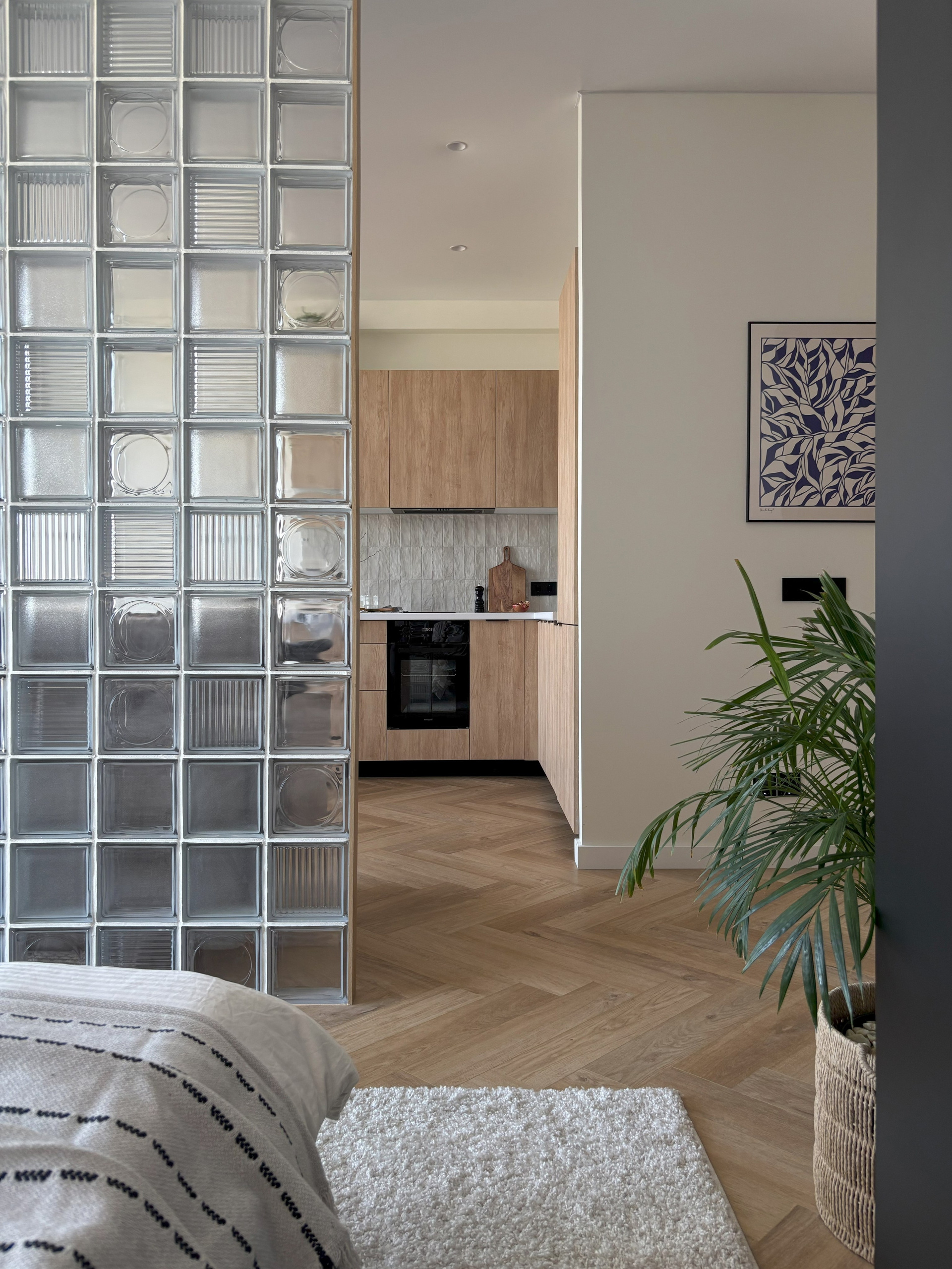 Зону гостиной и спальни изначально должны были разграничивать рейки. Но мы предложили заменить их на более актуальное решение — стеклоблоки. И остались в выигрыше: свет проникает, зоны визуально отделены, в центре студии появился арт-объект, ставший сердцем квартиры.