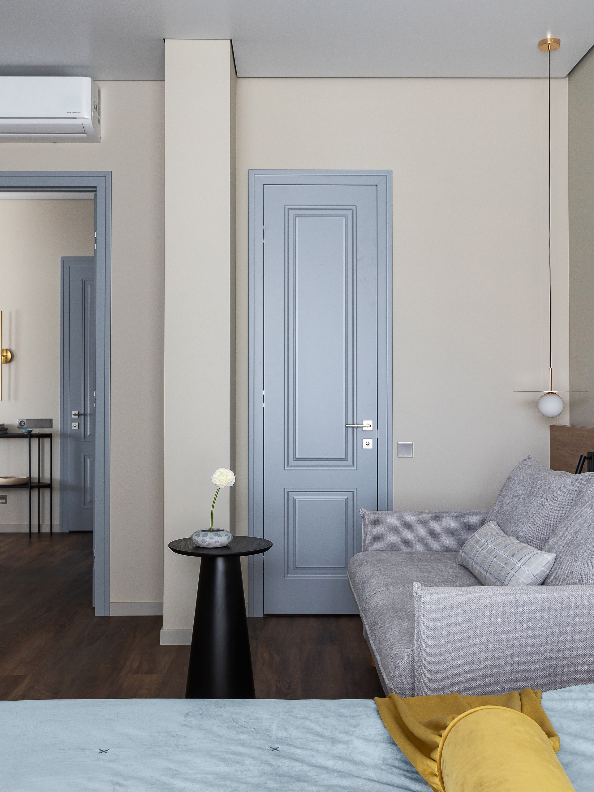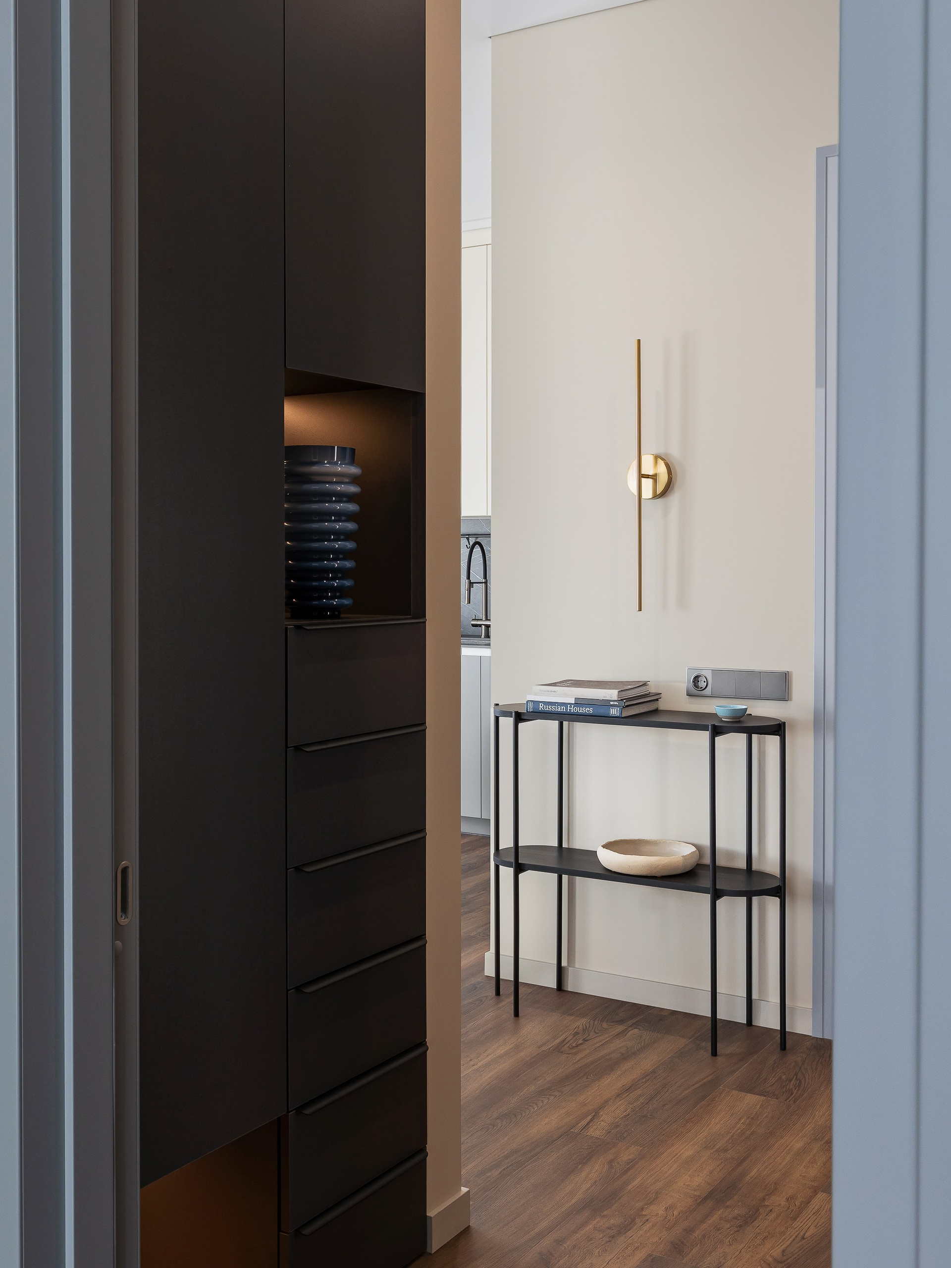 Планировочно квартира разделена на две основные зоны: кухня-гостиная — для общения и встреч, и спальня-кабинет — более приватное, спокойное пространство.