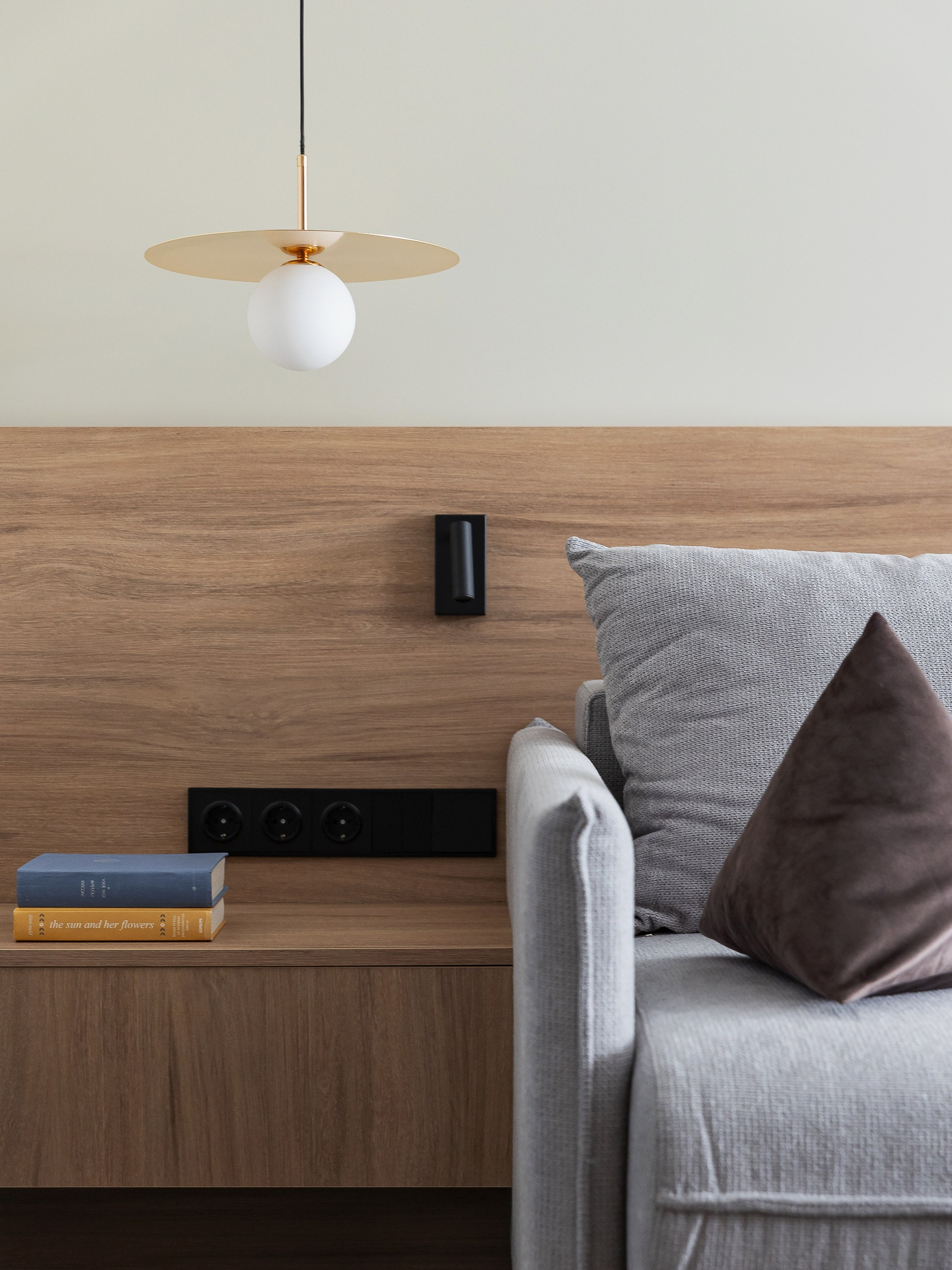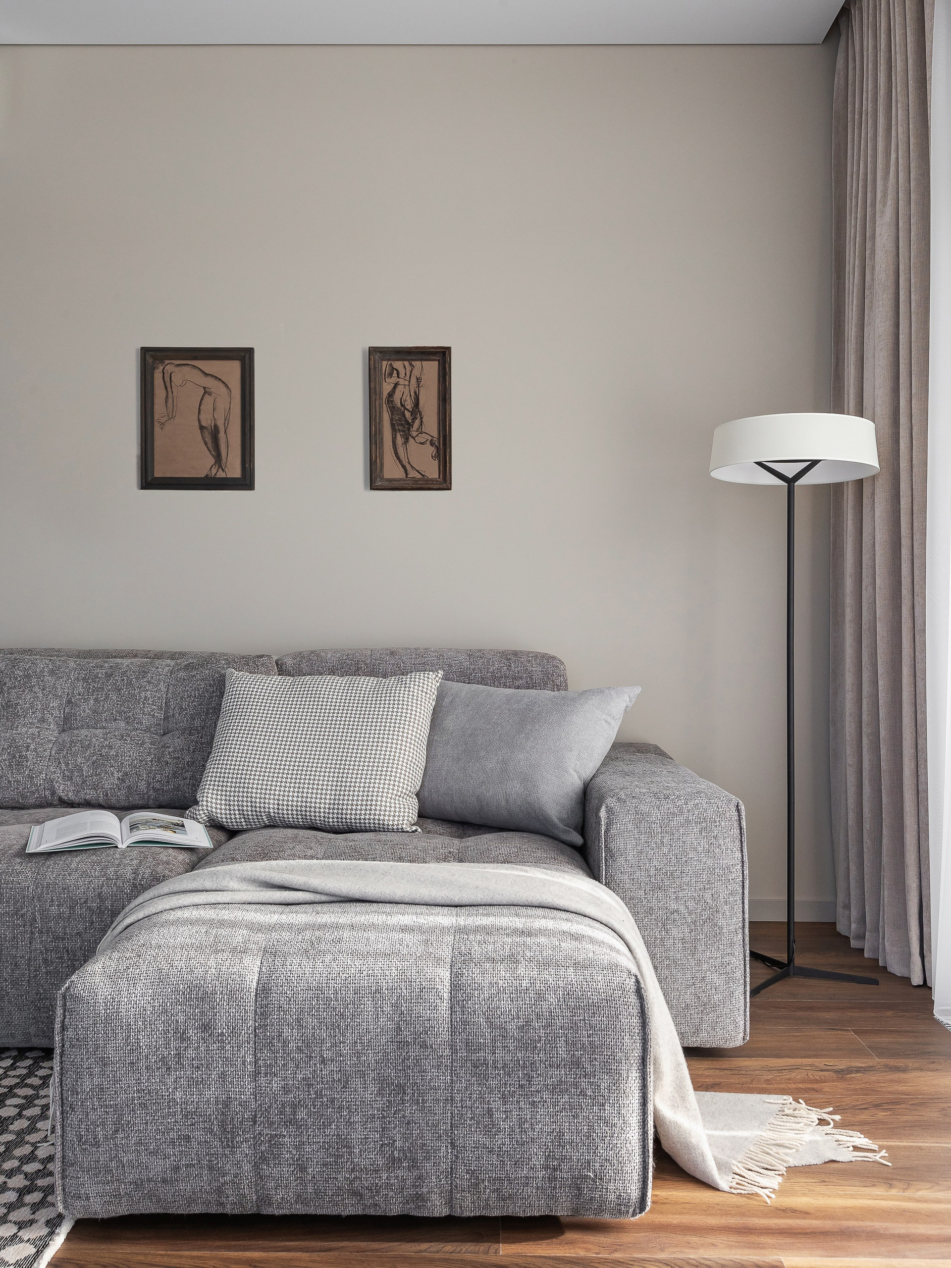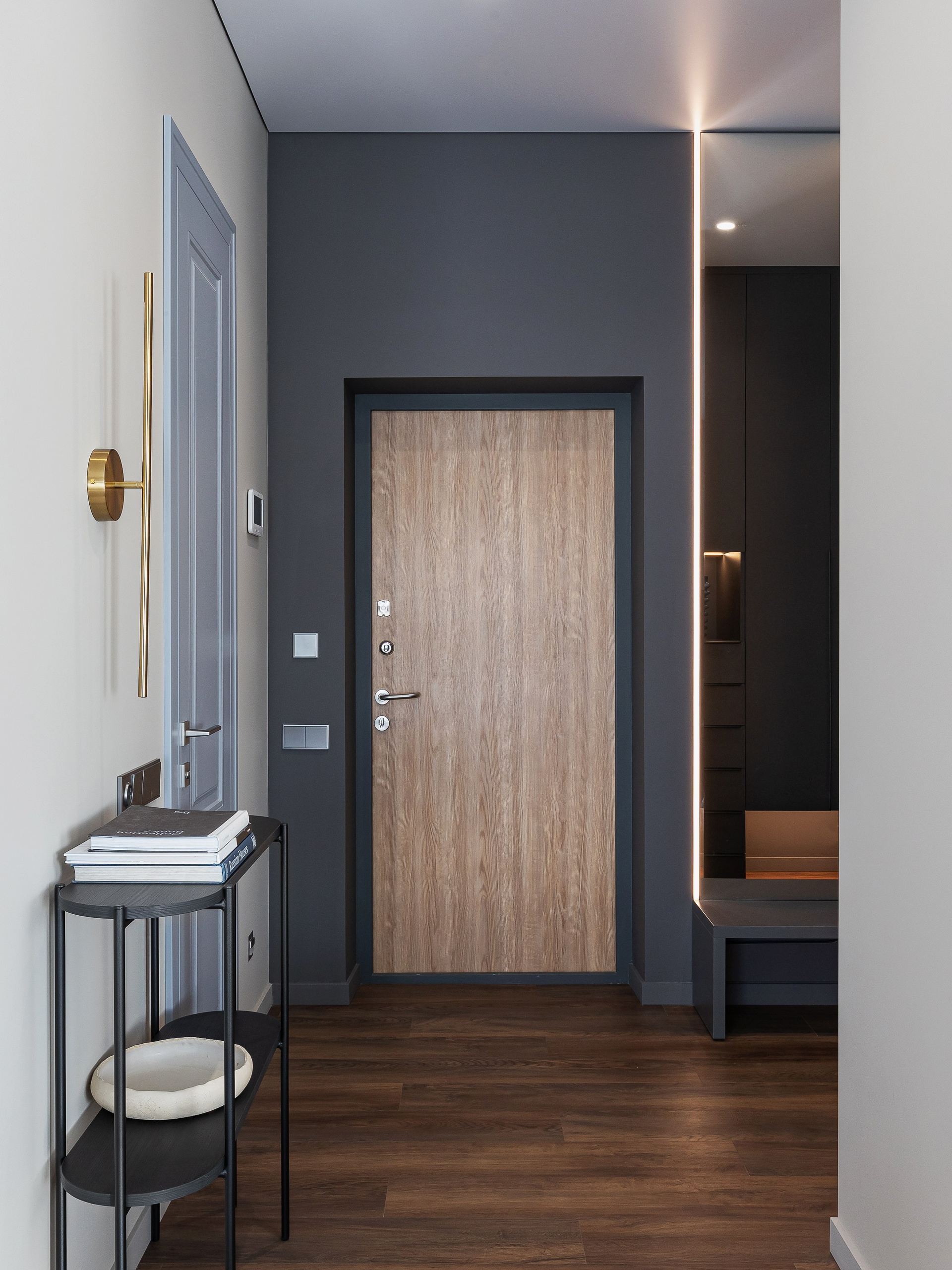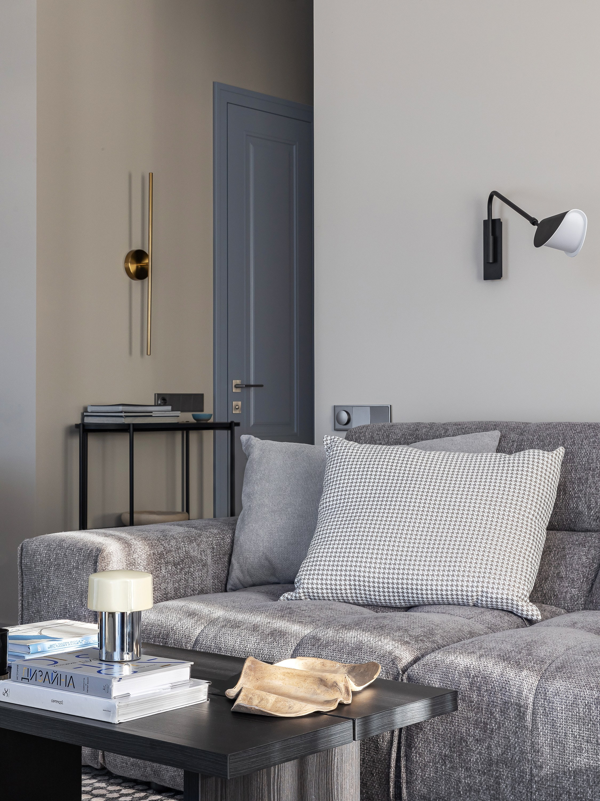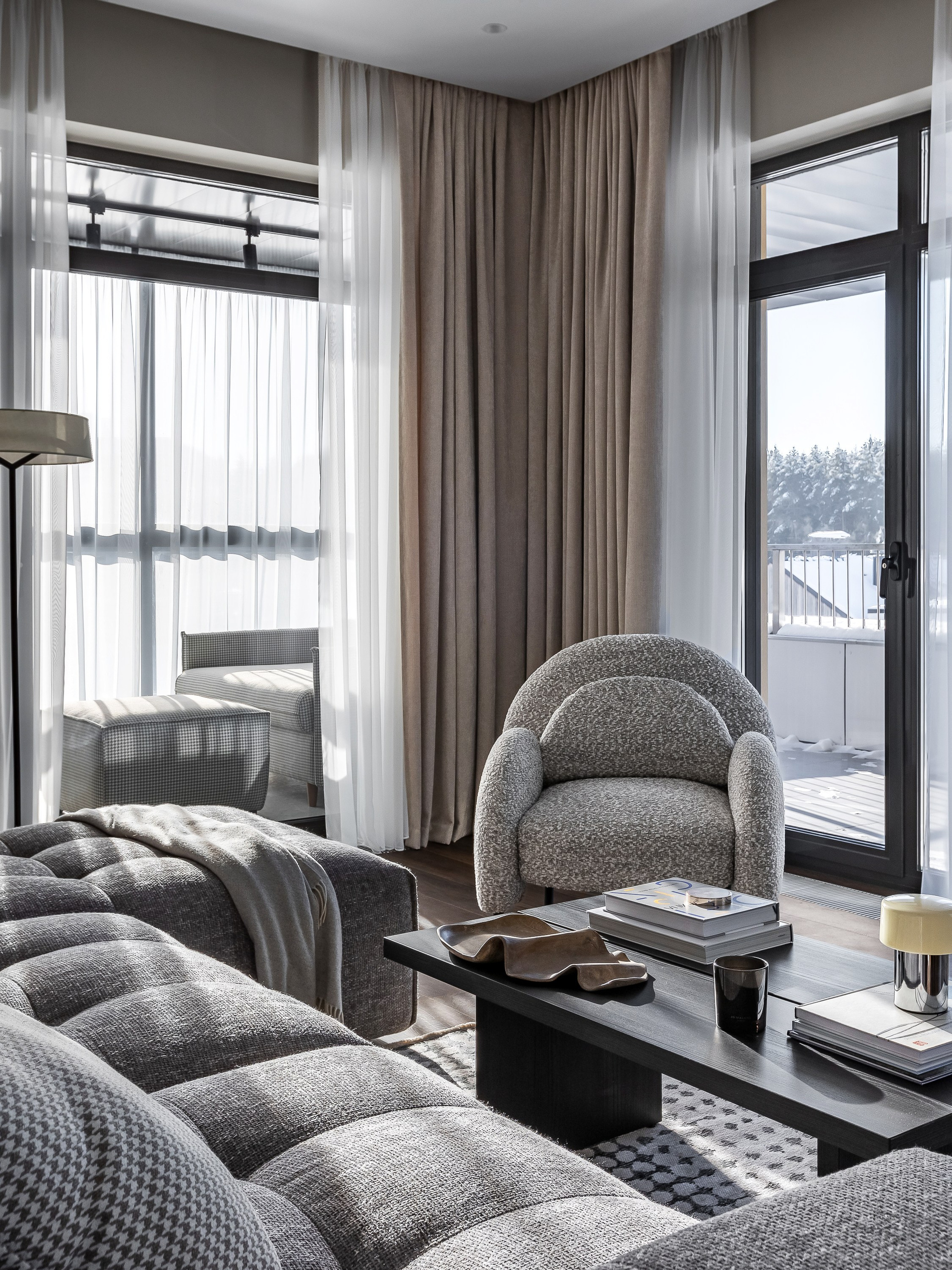 Этот интерьер создавался для взрослого мужчины, который много путешествует, любит принимать гостей и ценит комфорт. Квартира 77 квадратов расположена на третьем этаже урбан-виллы квартала «Пирс», с потрясающим видом на живописные ели. Такой умиротворяющий вид стал отправной точной проекта — хотелось создать спокойную, созерцательную атмосферу, чтобы ничто не отвлекало от единения с природой.