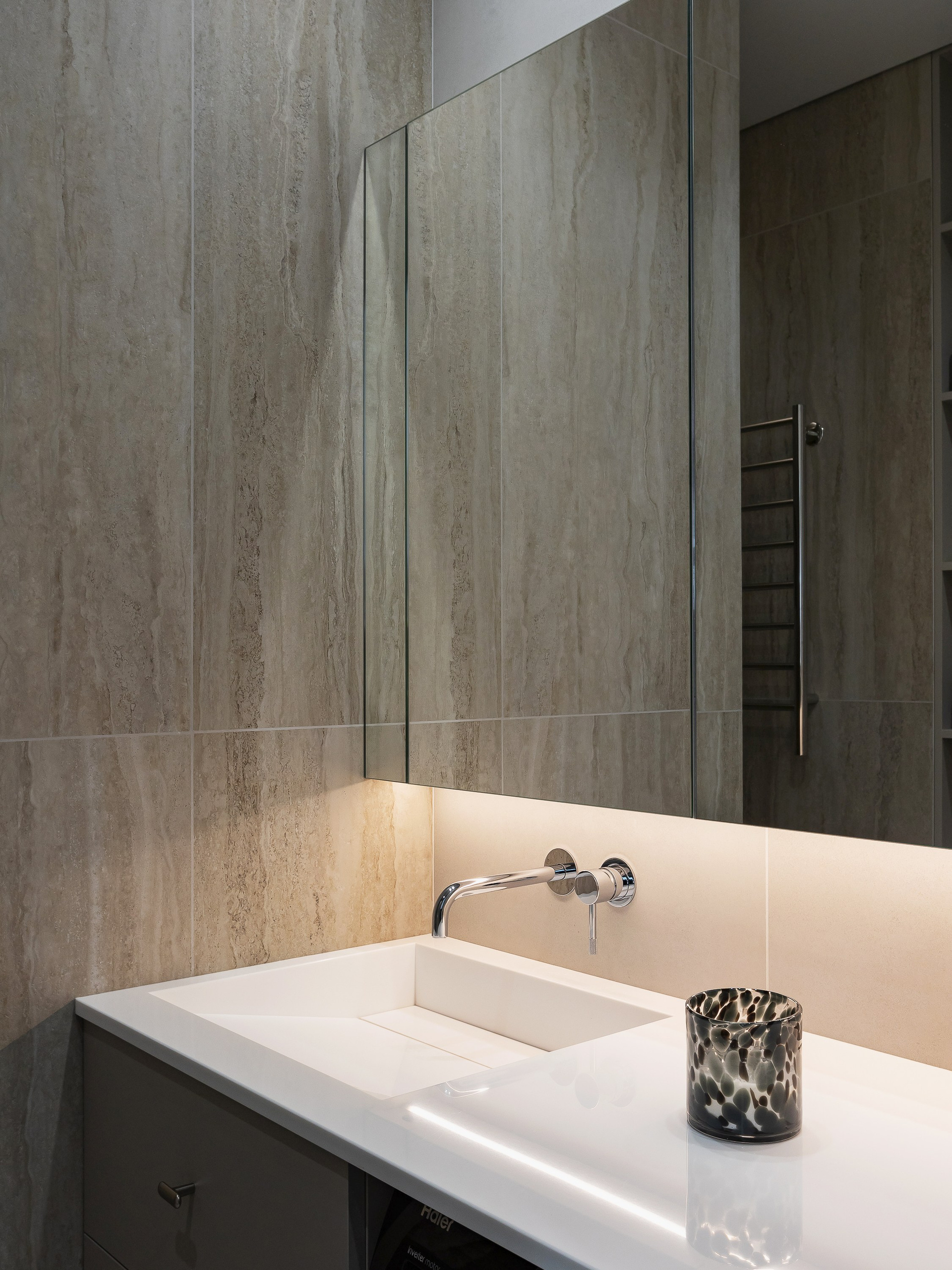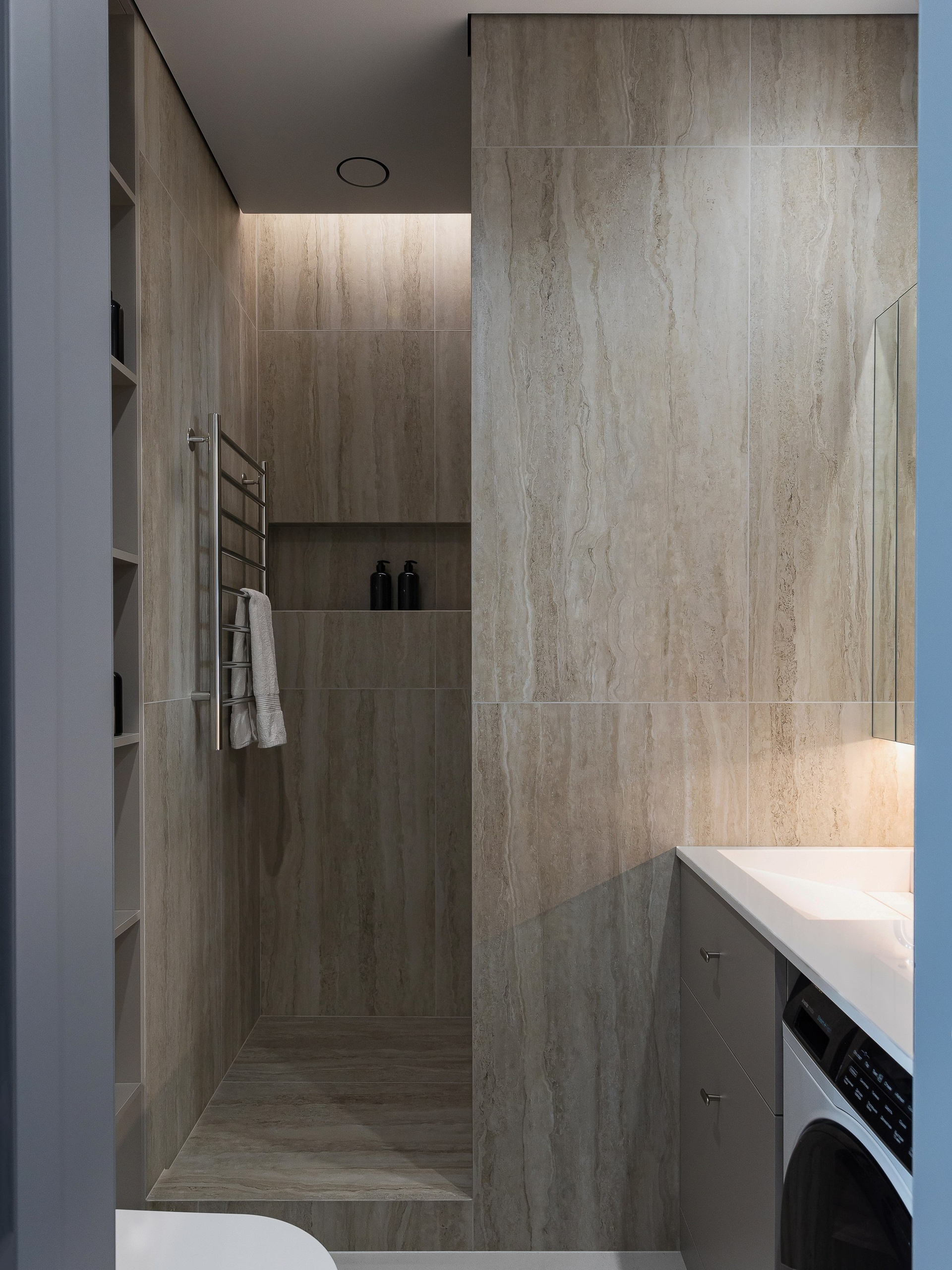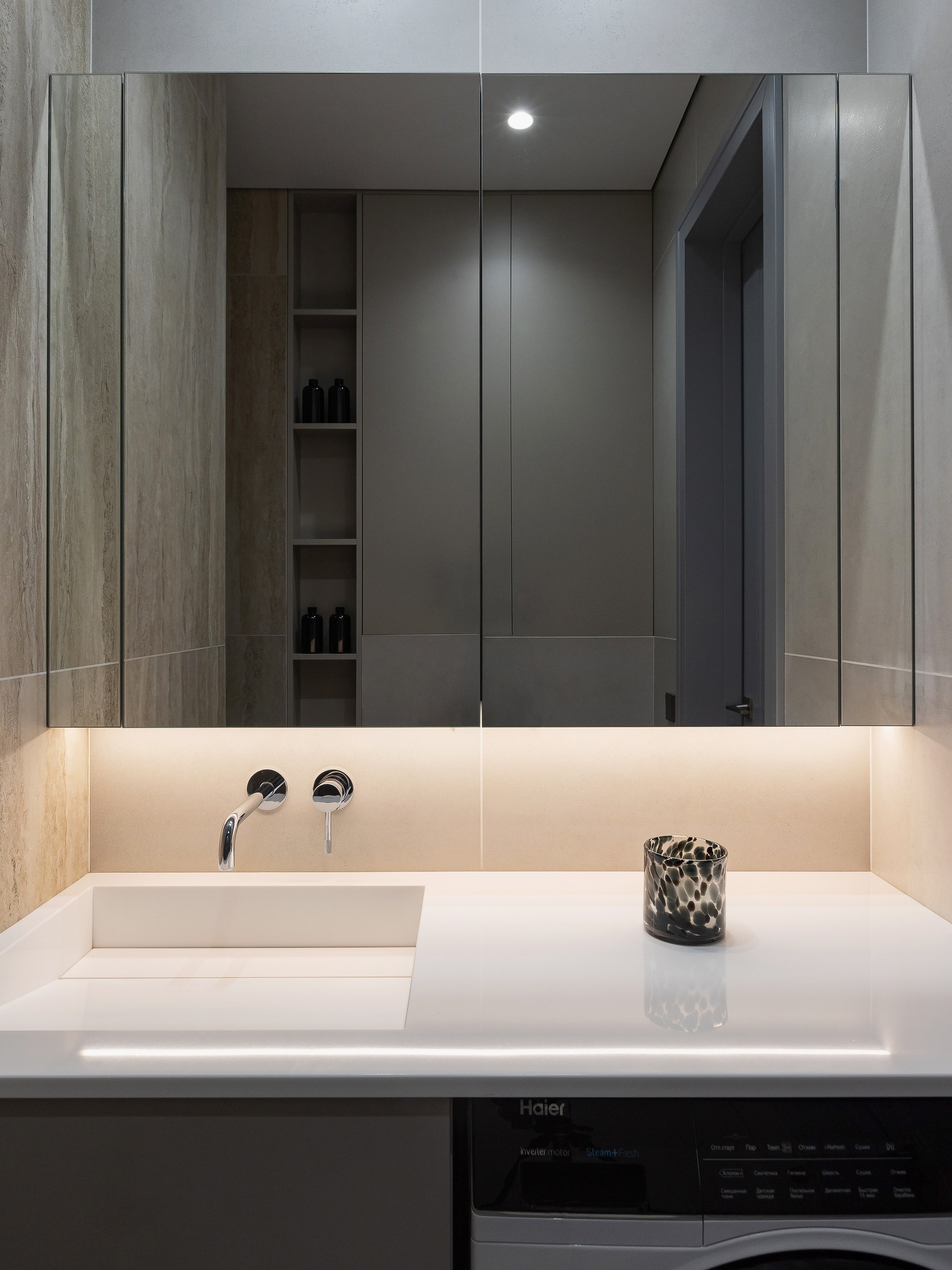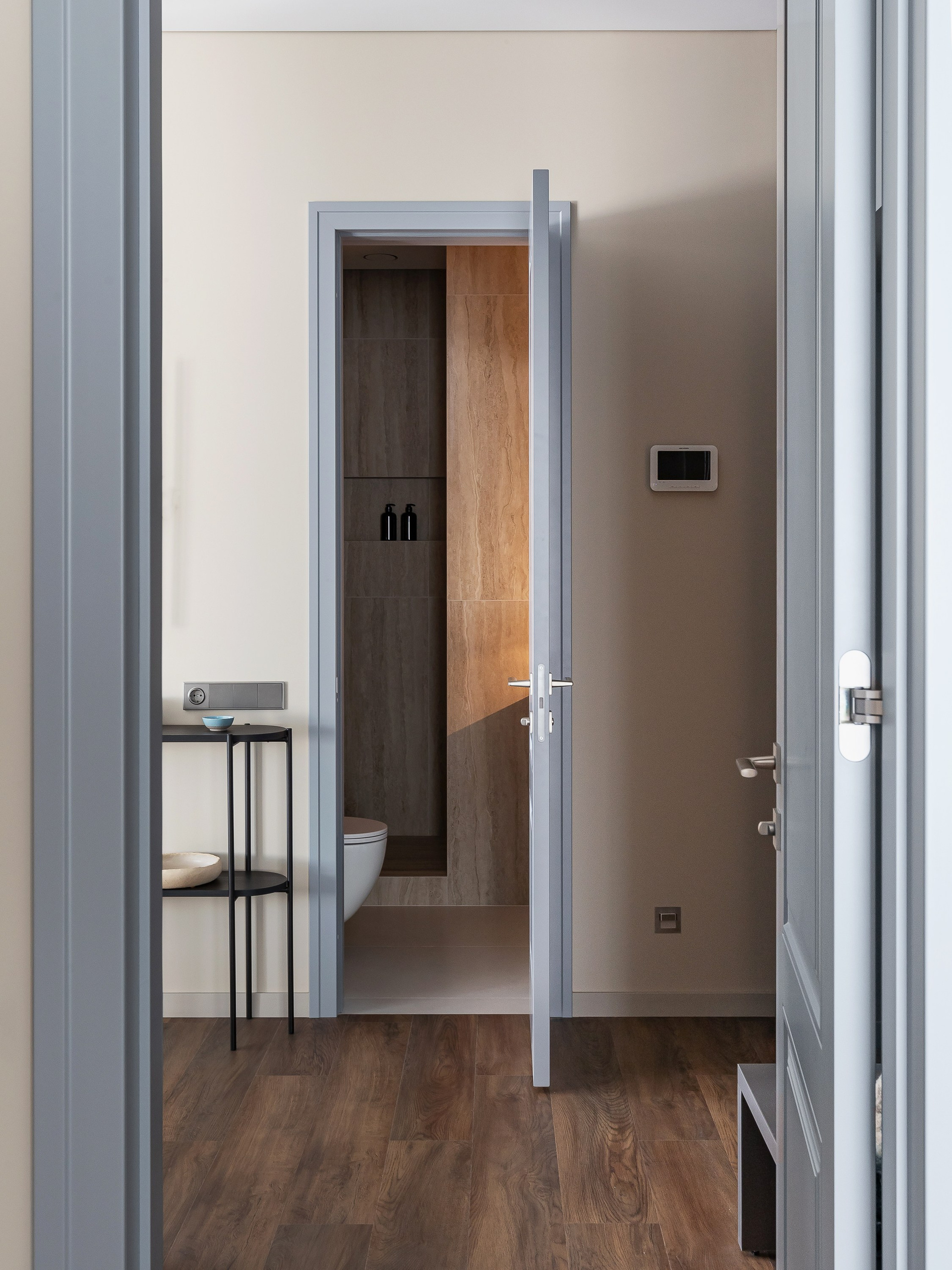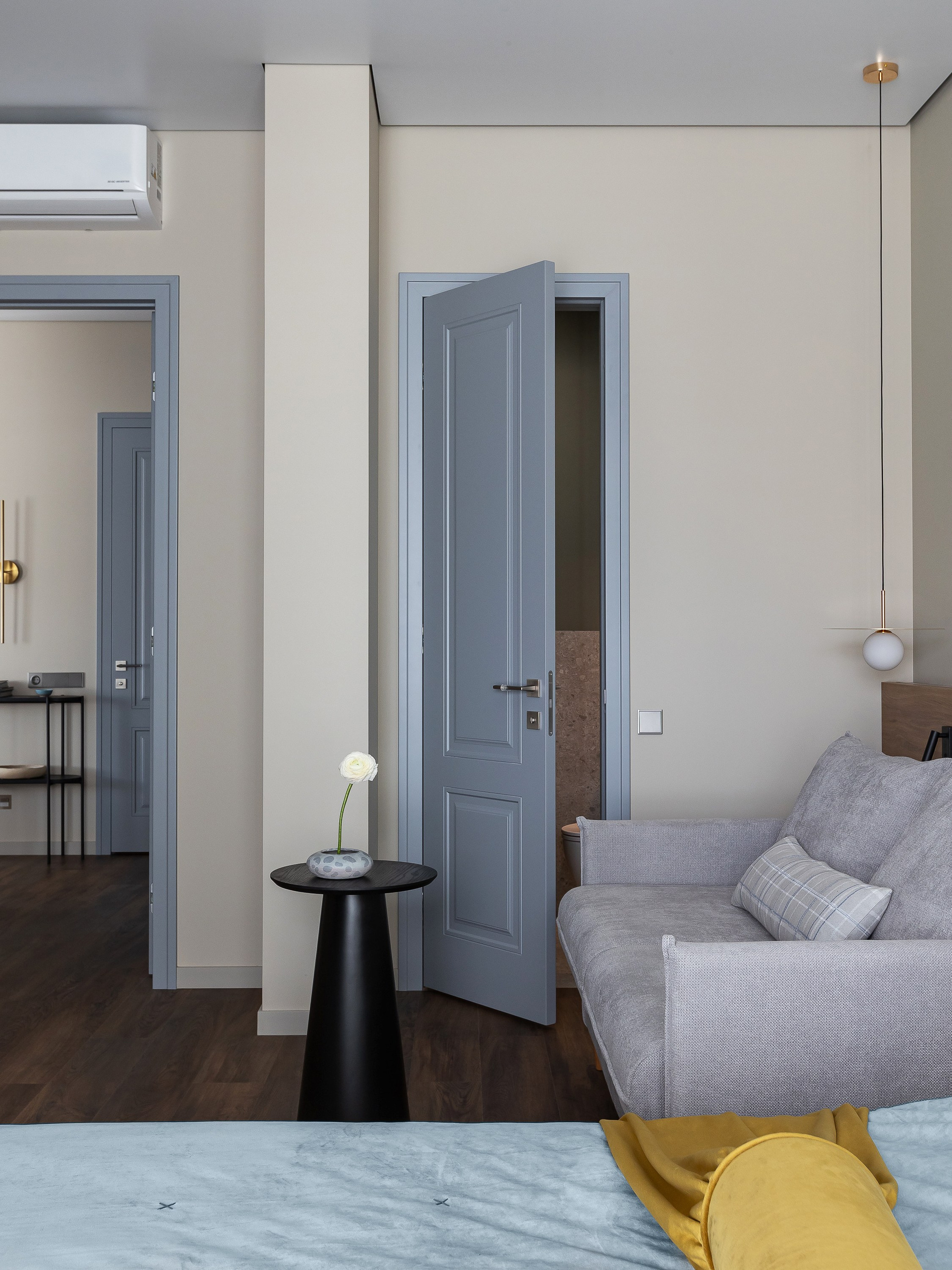 В квартире предусмотрены два санузла — полноценная ванная комната с душевой и компактный санузел при спальне, что обеспечивает комфорт владельцу и гостям во время ночёвок. В отделке использовались преимущественно антивандальные и практичные решения, что помогает сократить время на уход за пространством.