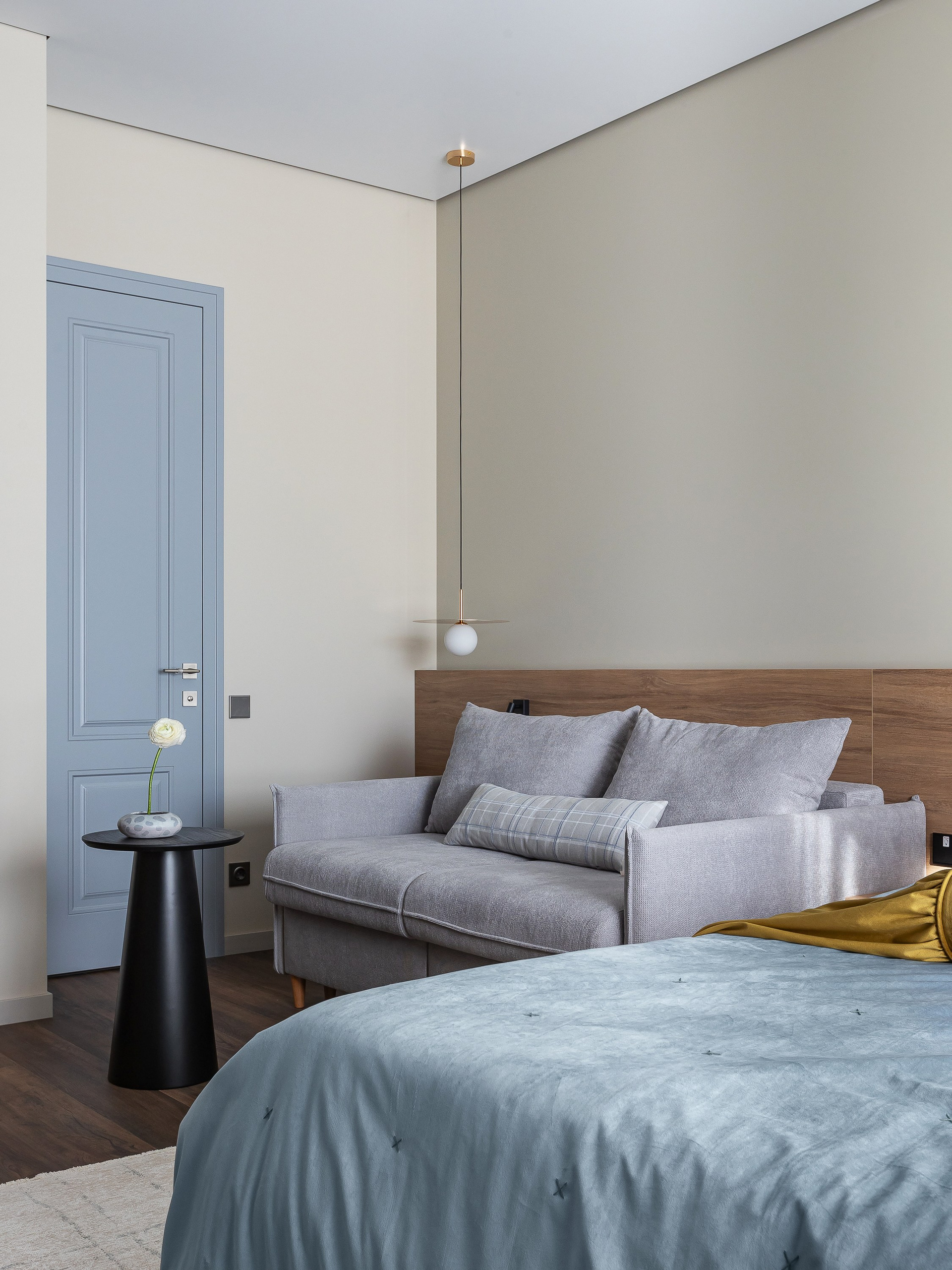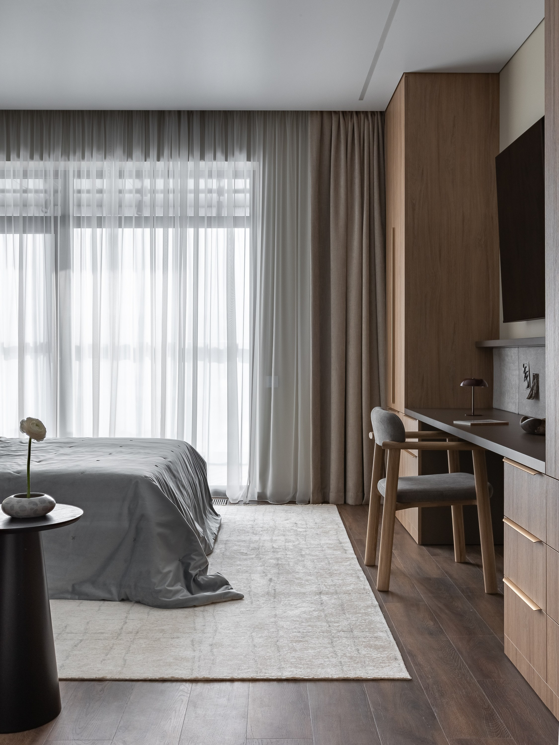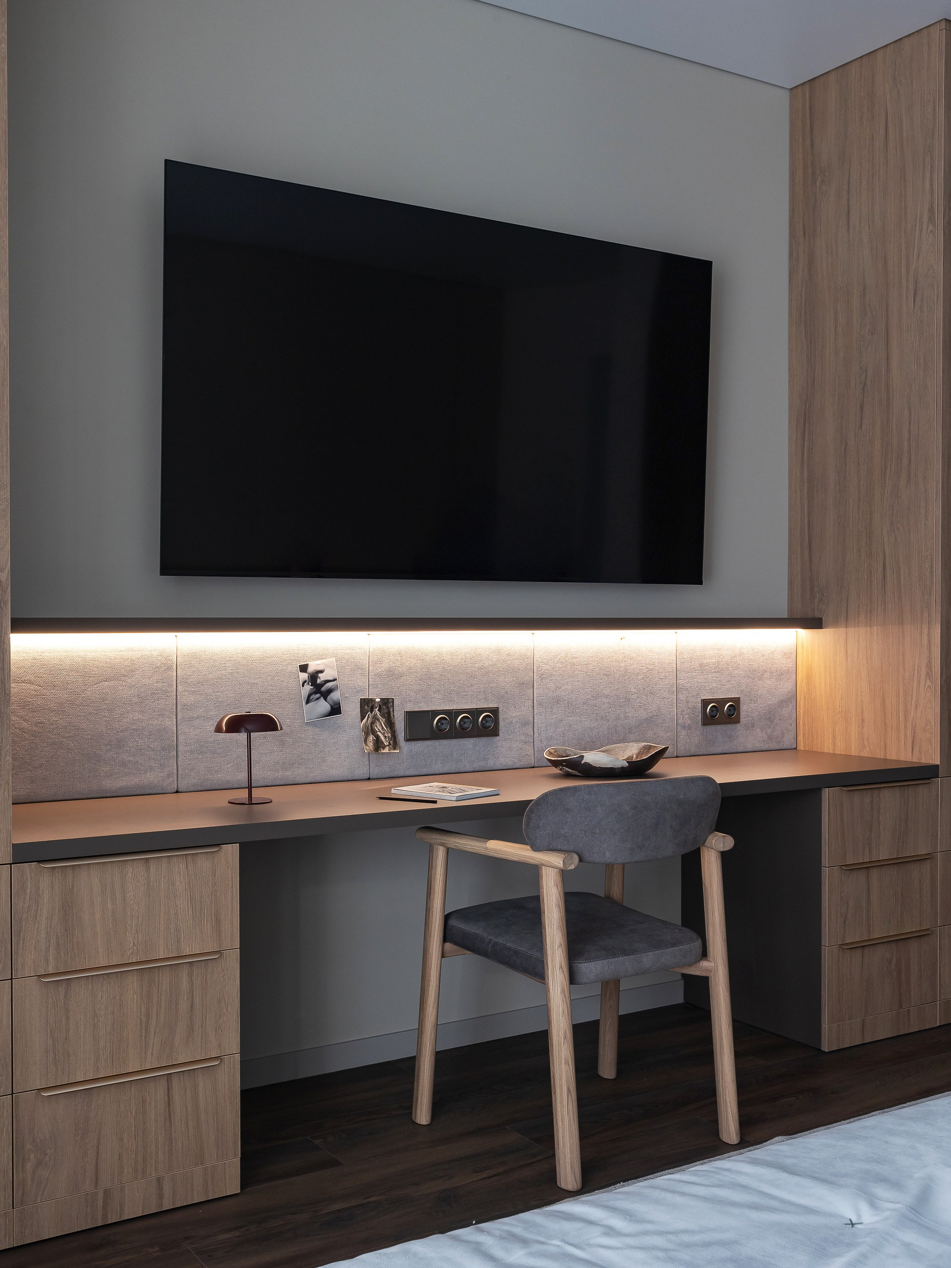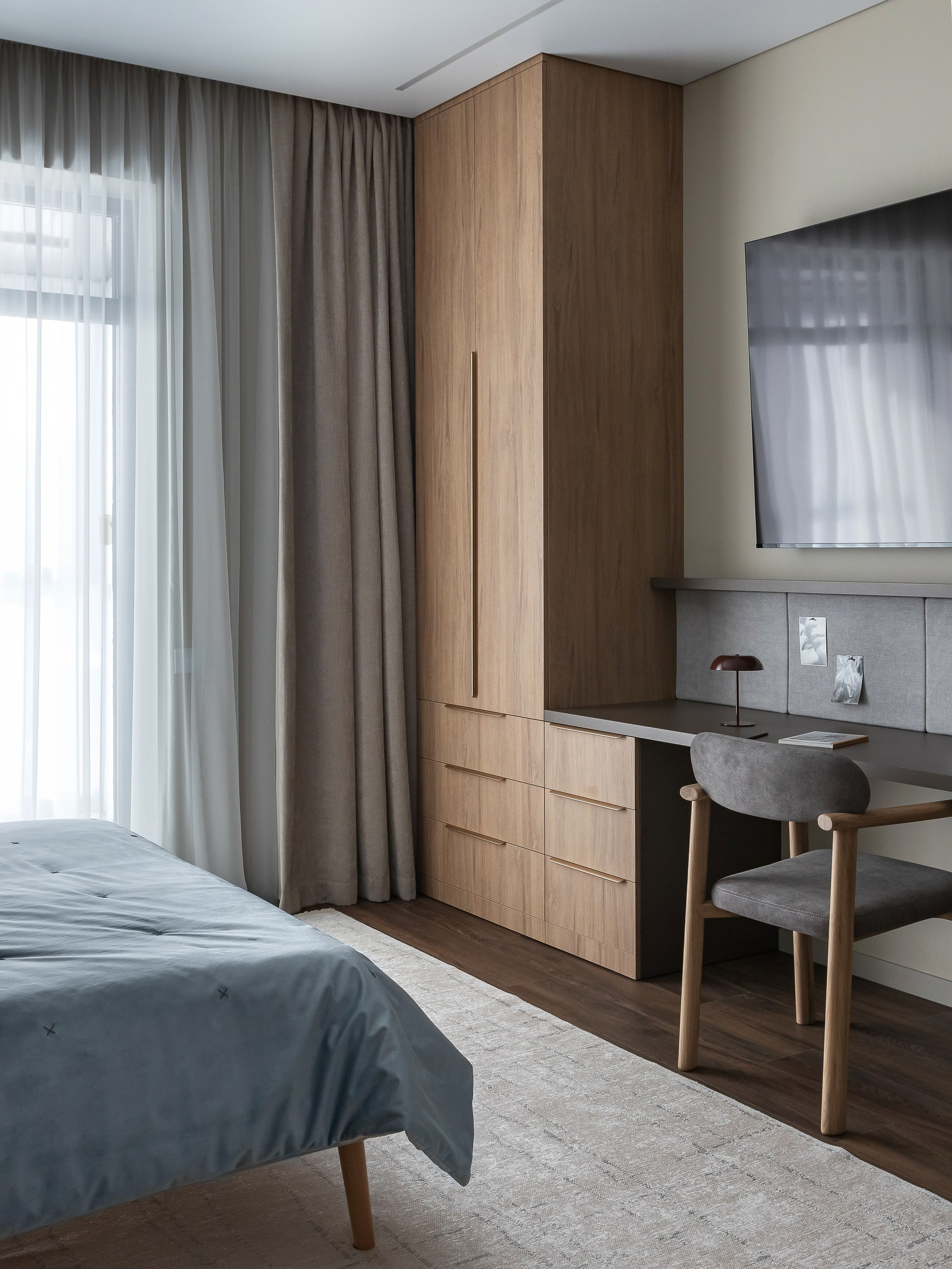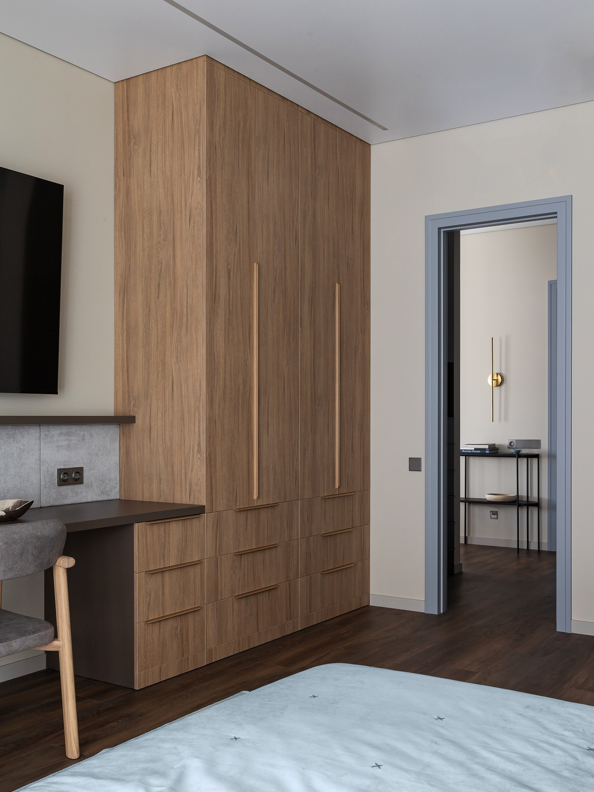 Любовь владельца к кино определила количество сценариев для просмотра: телевизор в спальне можно комфортно смотреть как с кровати, так и с дивана. Рабочая зона объединена в одну общую конструкцию с гардеробными шкафами. Над столом предусмотрена полка с подсветкой и мягкие панели для крепления заметок и актуальных задач.