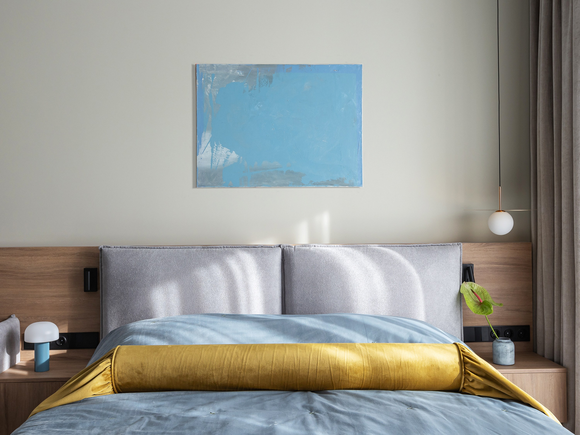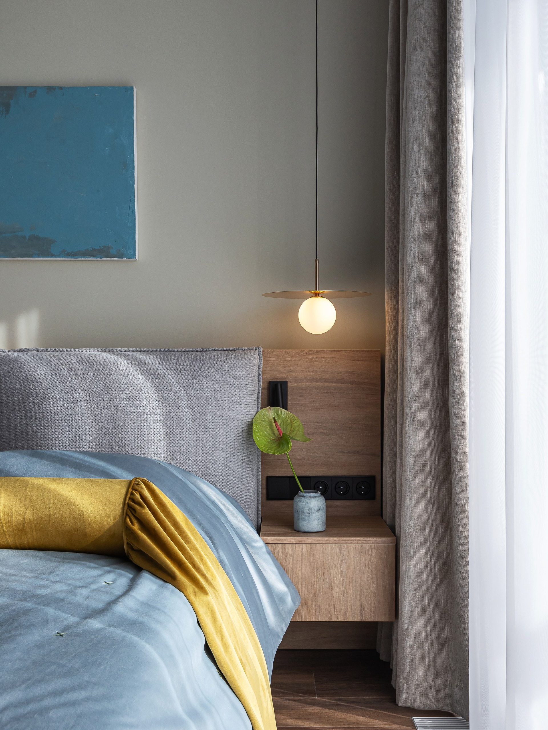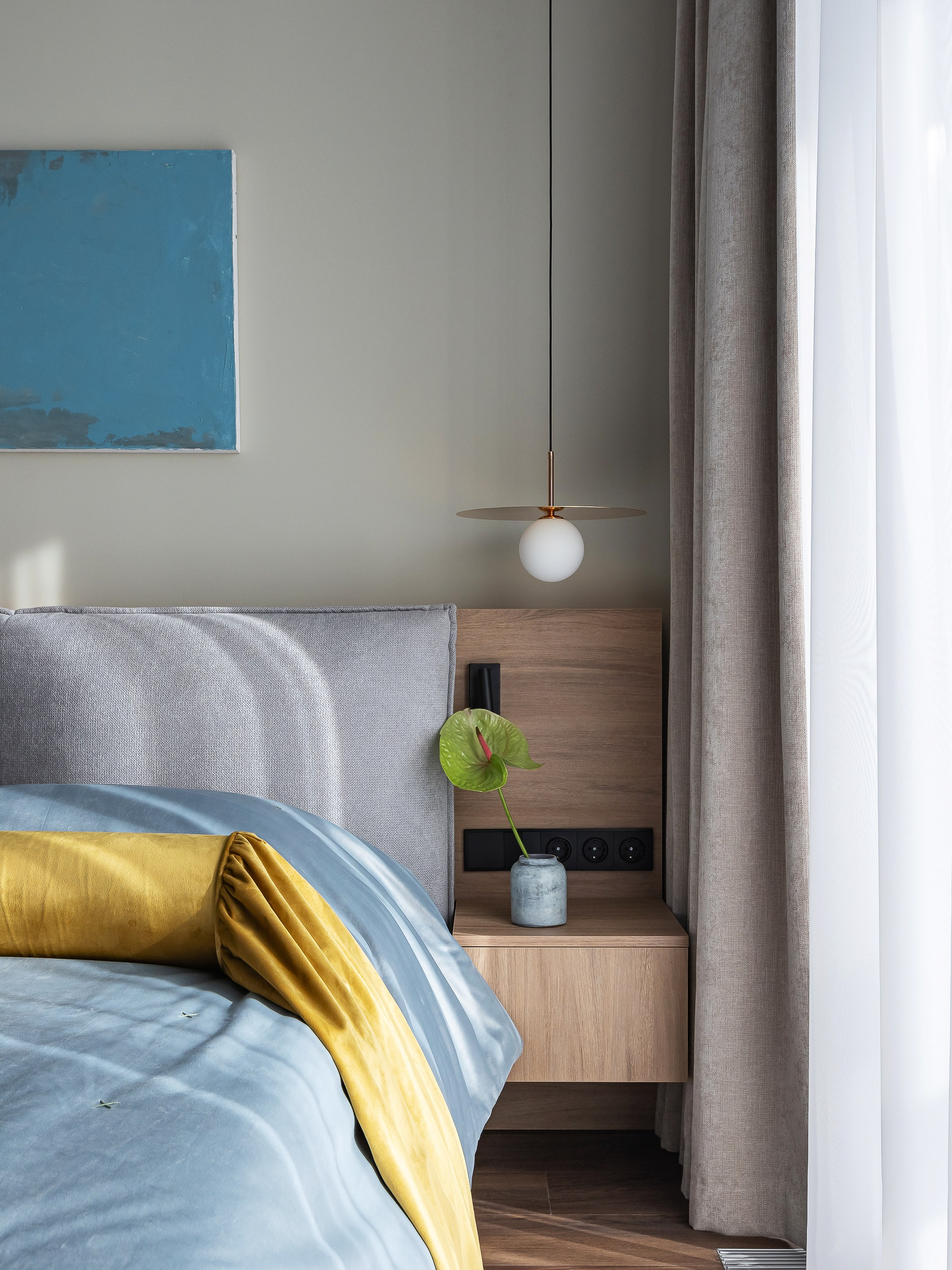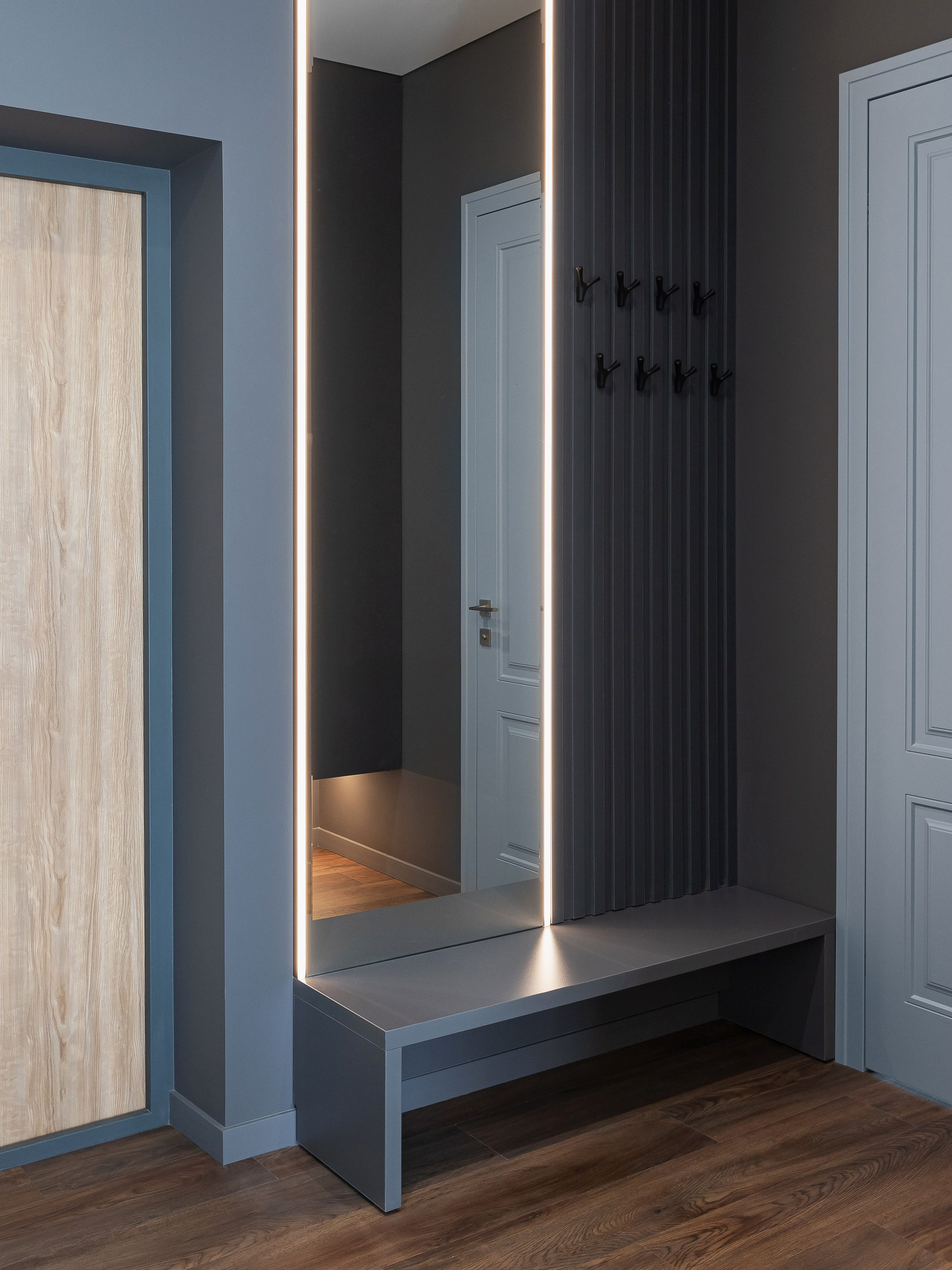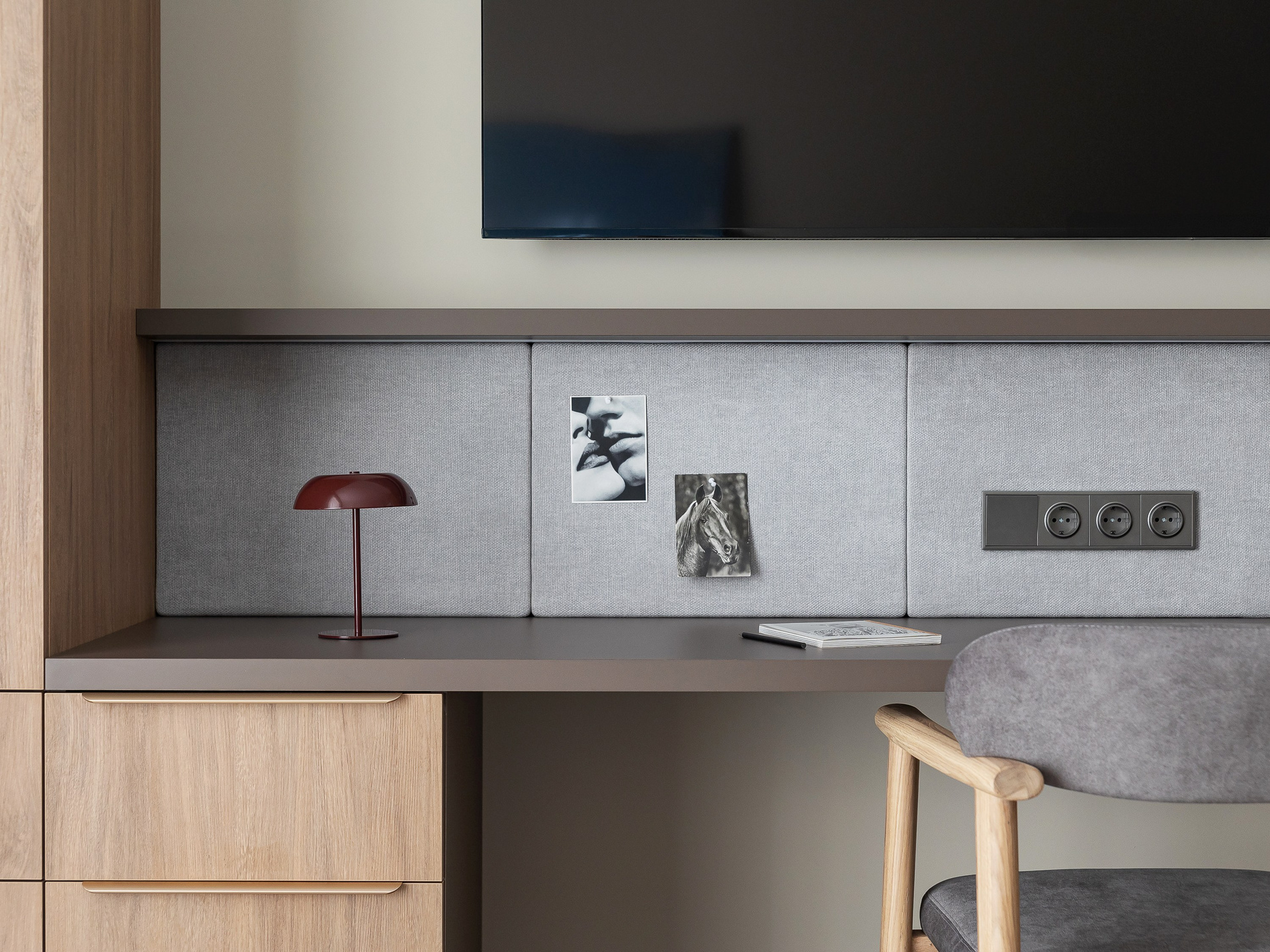Любовь владельца к кино определила количество сценариев для просмотра: телевизор в спальне можно комфортно смотреть как с кровати, так и с дивана. Рабочая зона объединена в одну общую конструкцию с гардеробными шкафами. Над столом предусмотрена полка с подсветкой и мягкие панели для крепления заметок и актуальных задач.