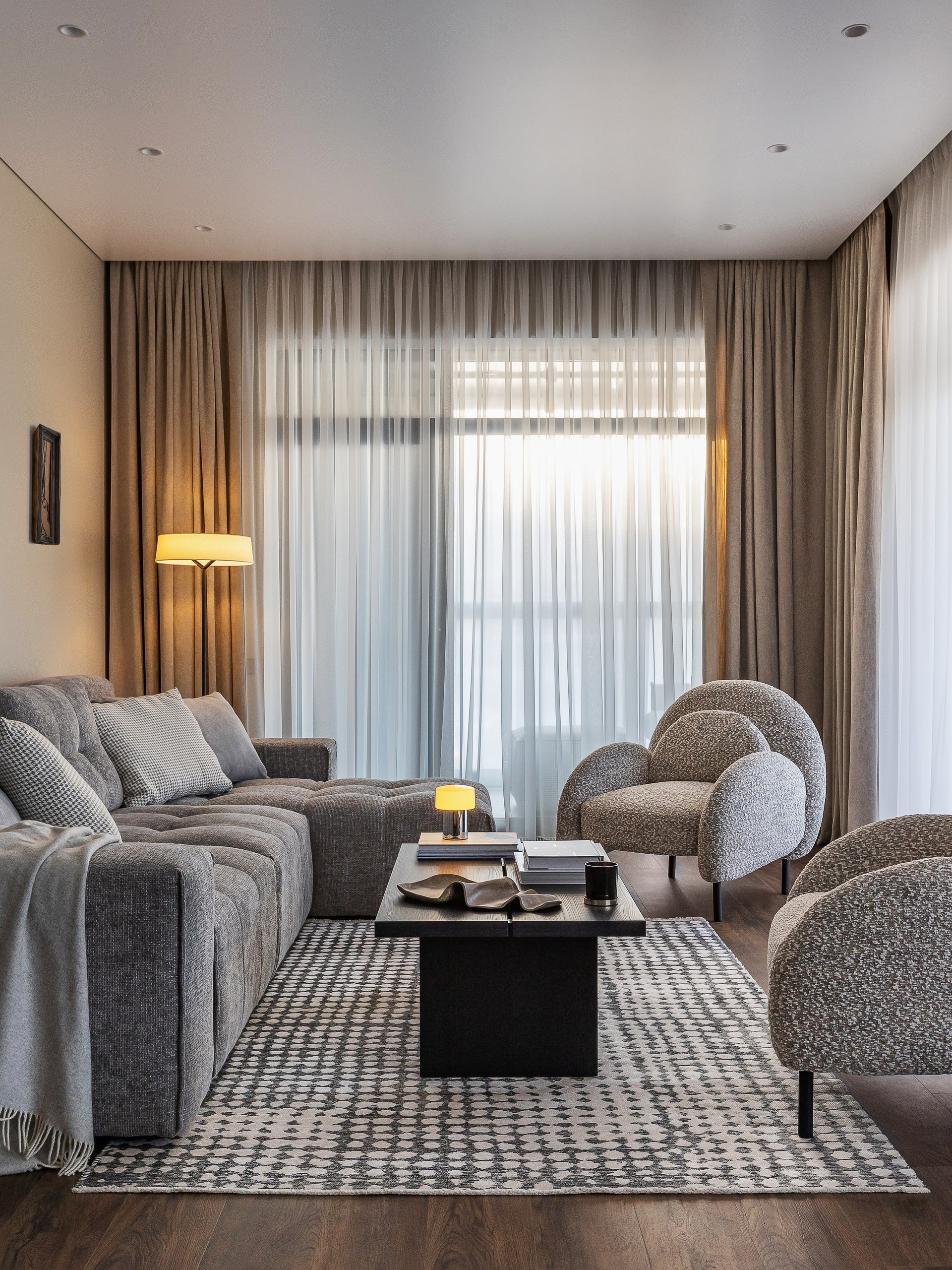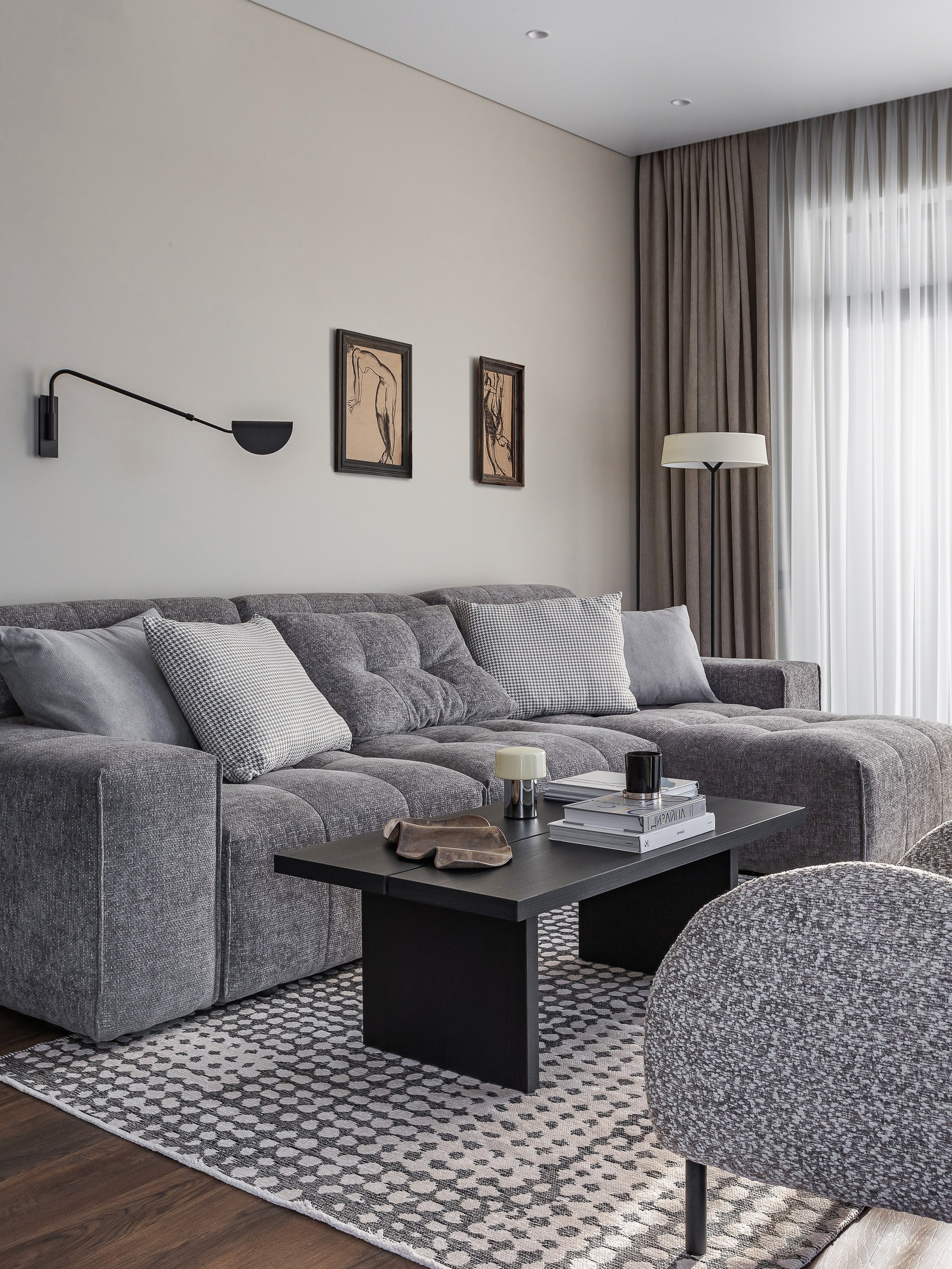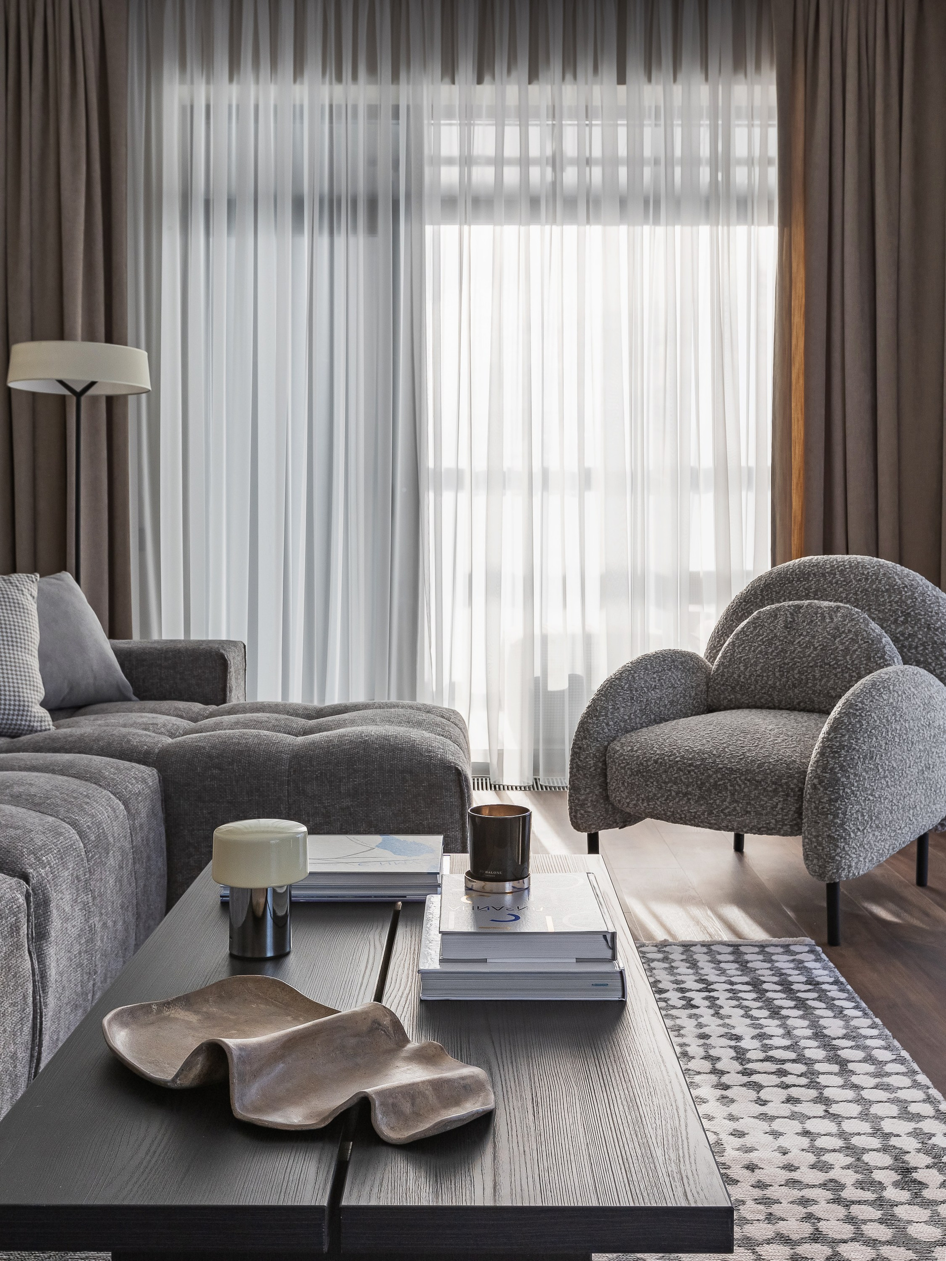 В интерьере использовано много предметов округлых форм, чтобы смягчить монументальность корпусной мебели и привнести желанный баланс.