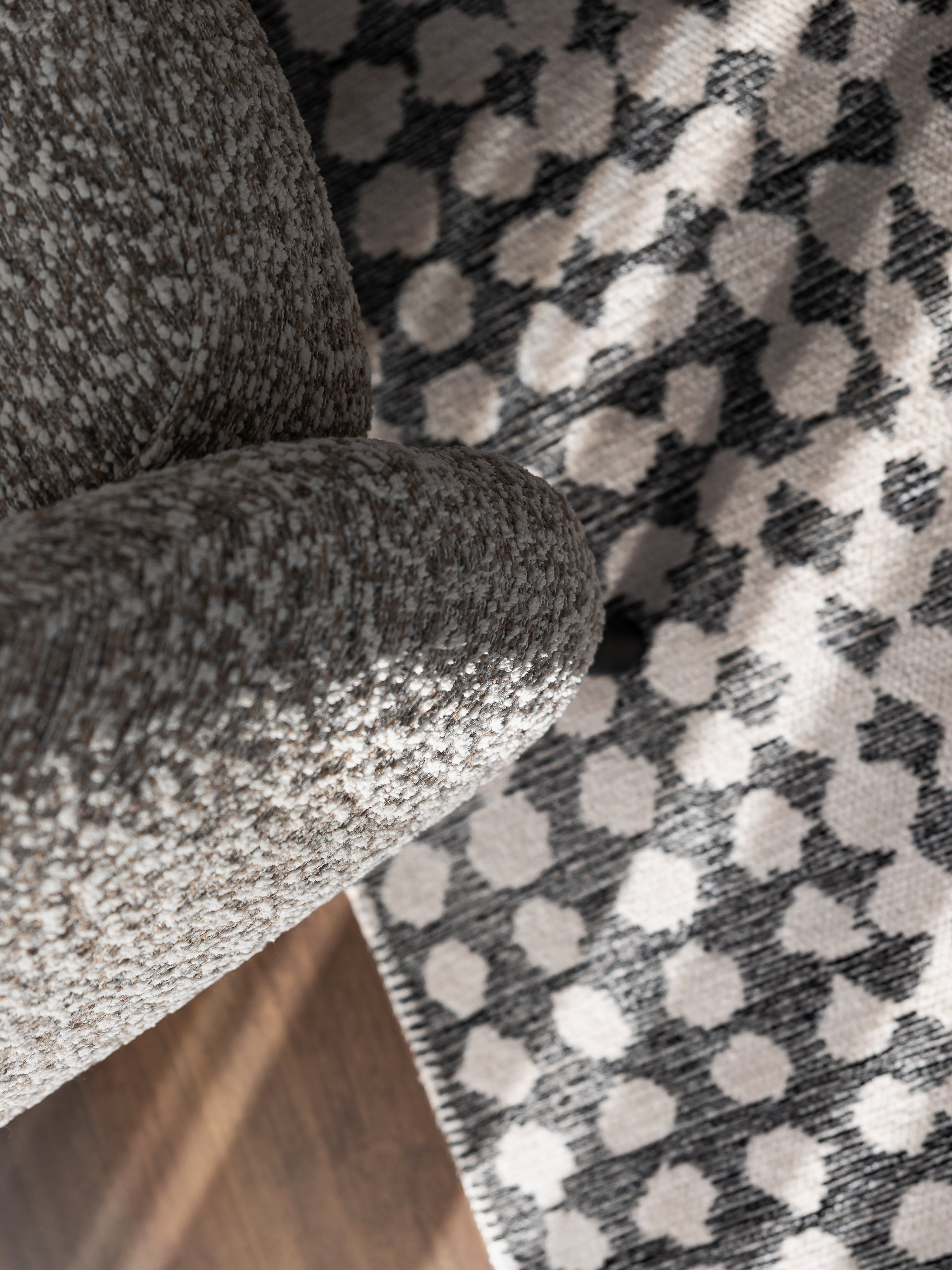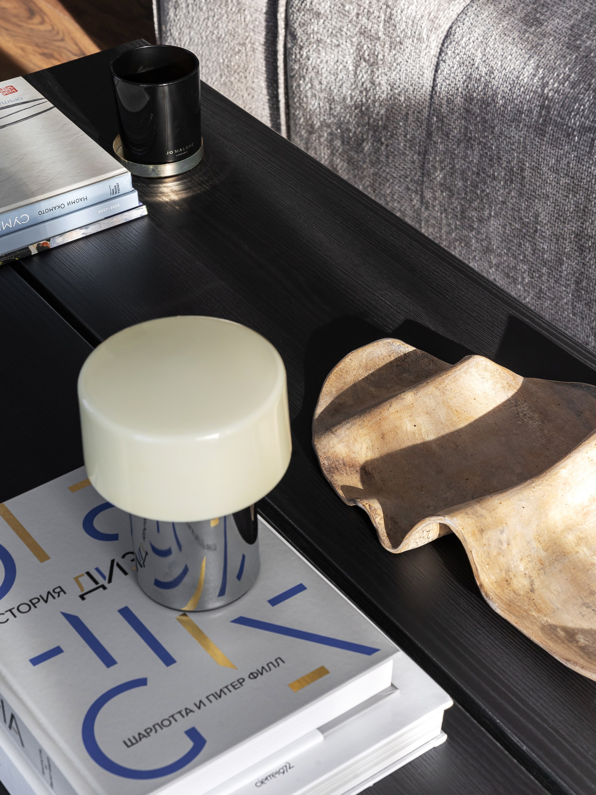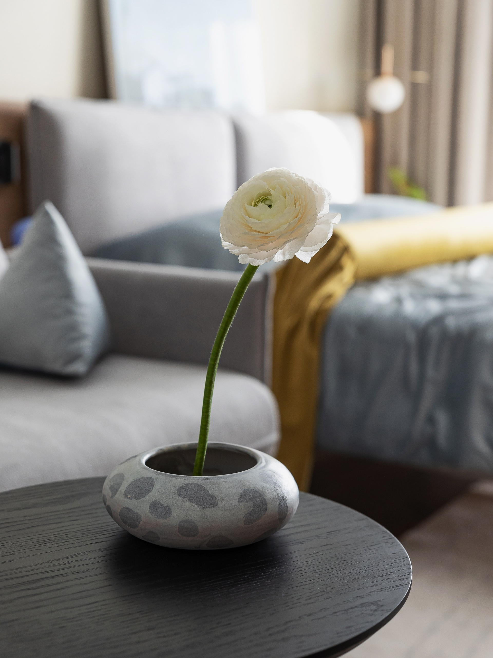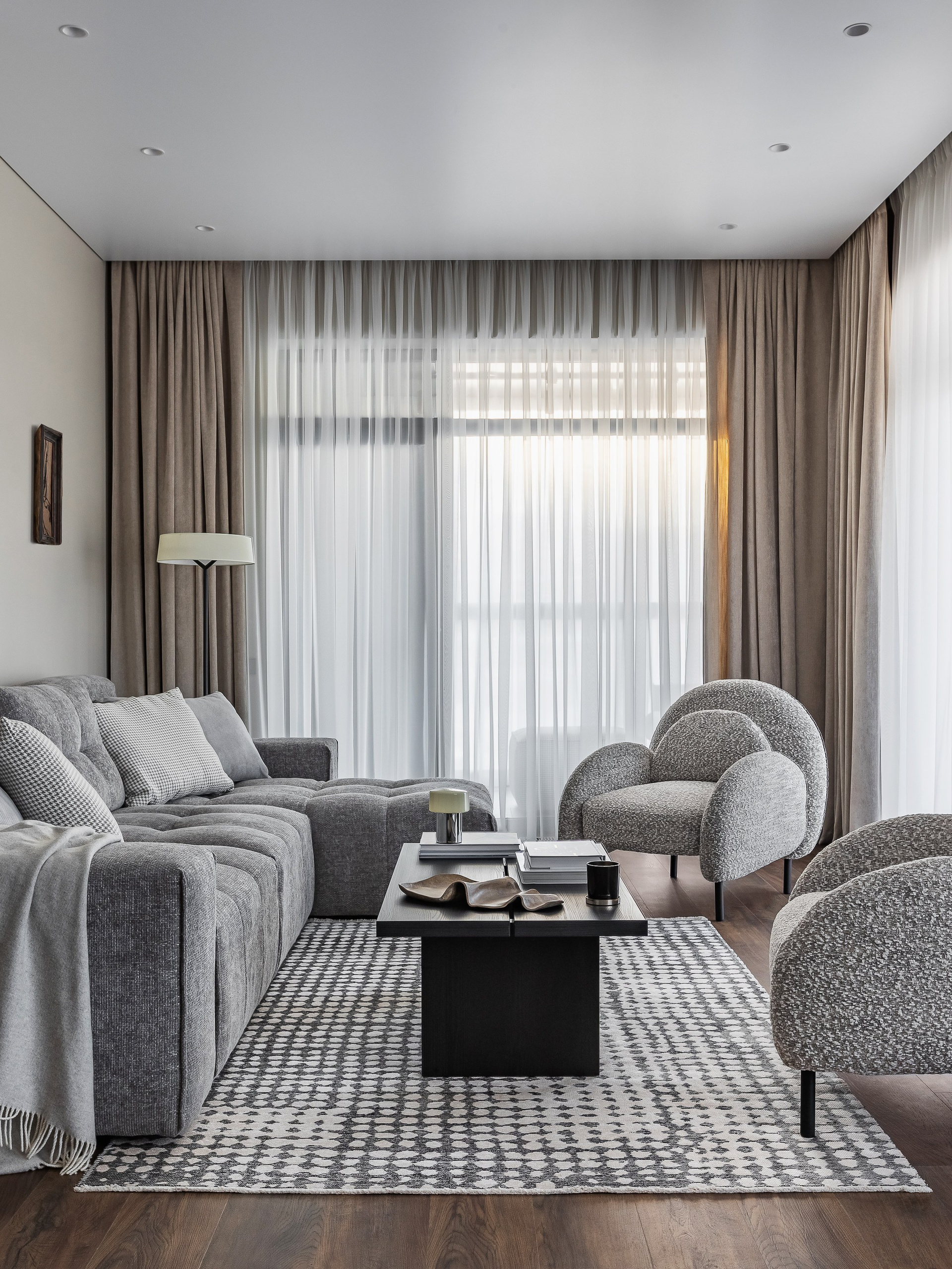 В интерьере использовано много предметов округлых форм, чтобы смягчить монументальность корпусной мебели и привнести желанный баланс.