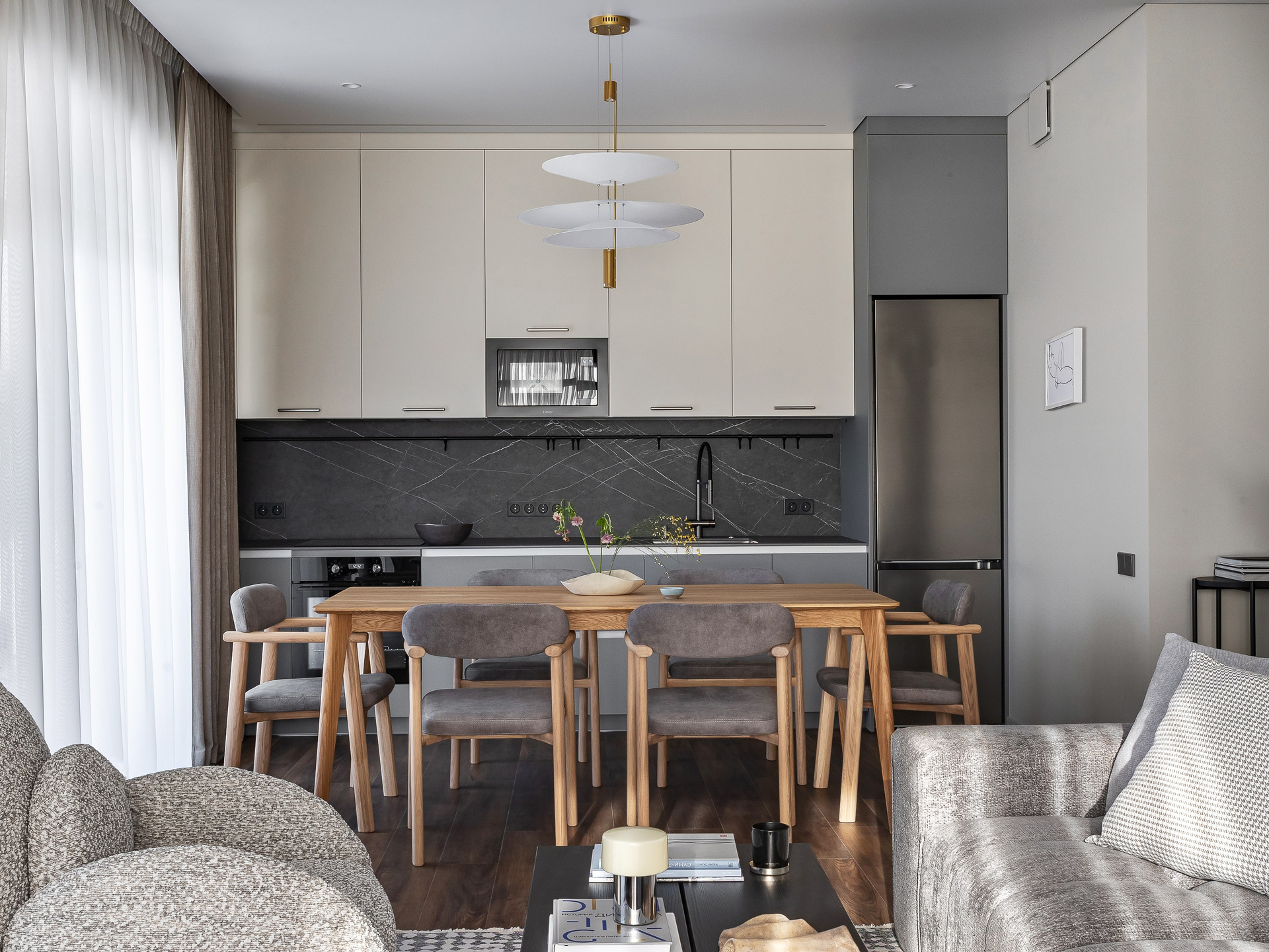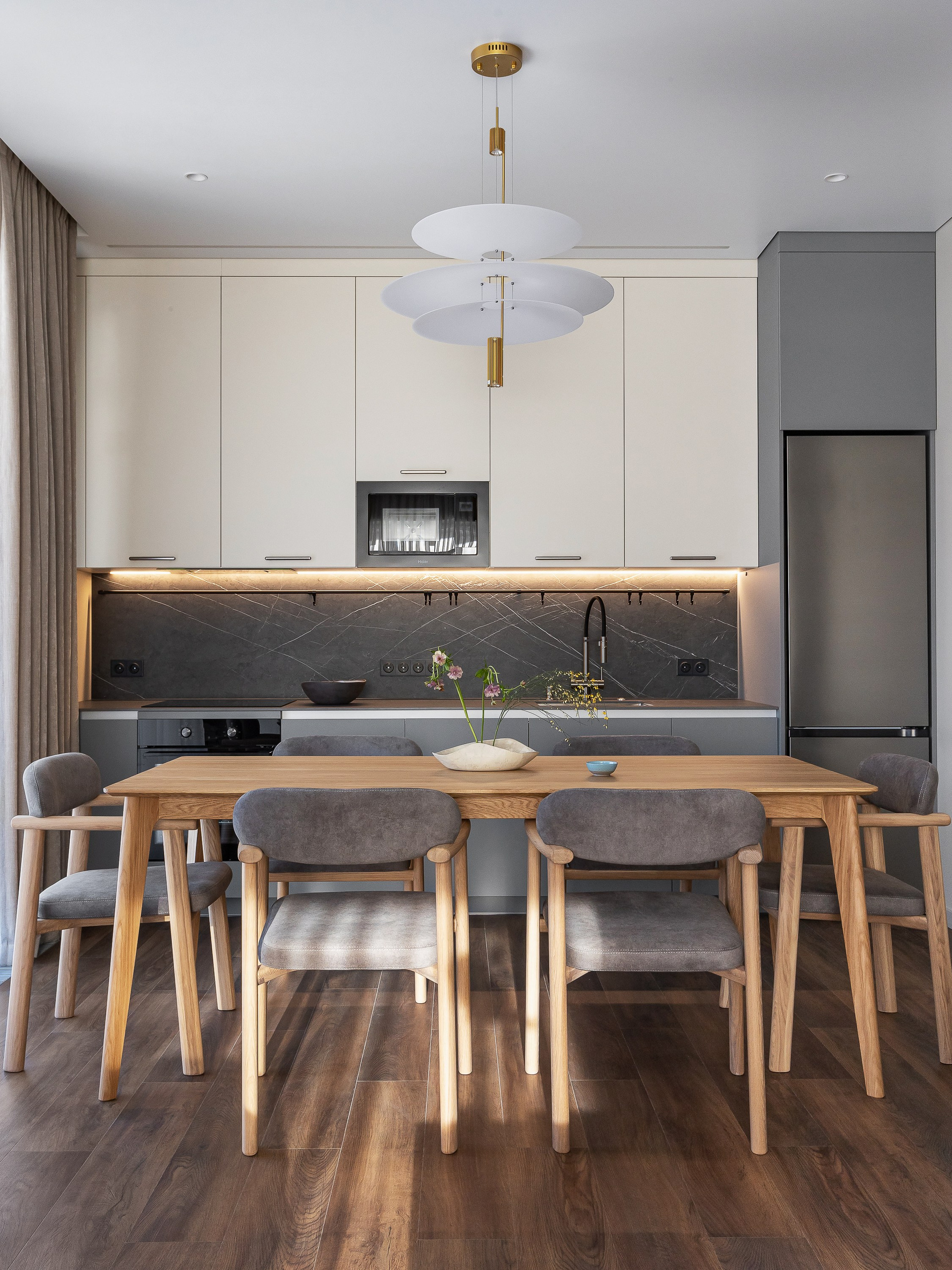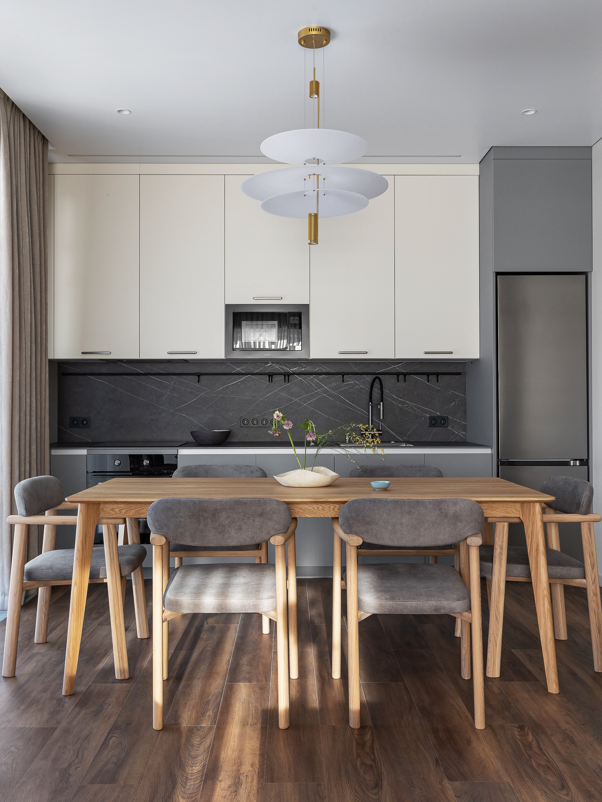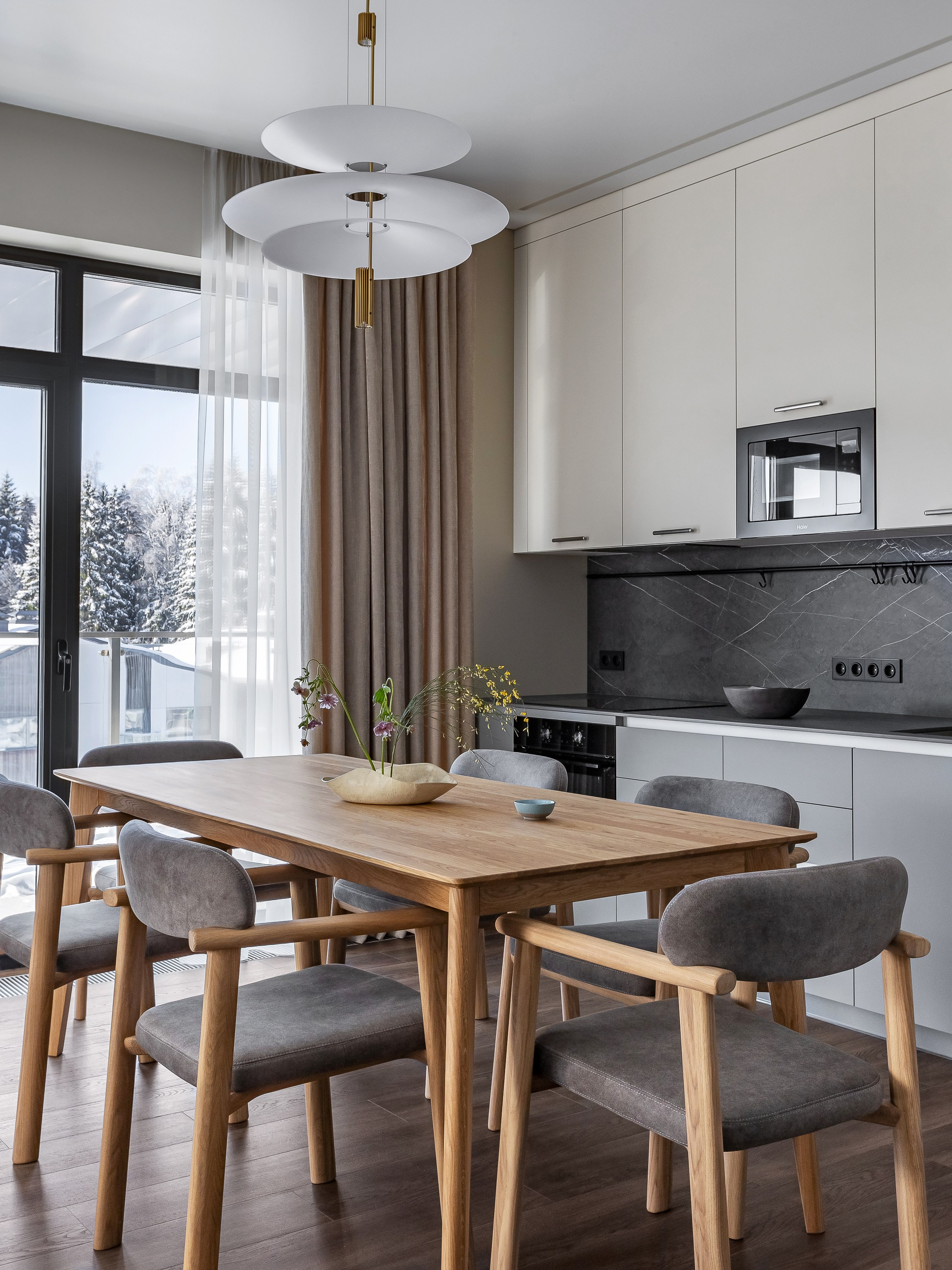 Стол из массива дерева в обеденной зоне добавляет теплоты в сдержанный интерьер и вмещает большое количество гостей.