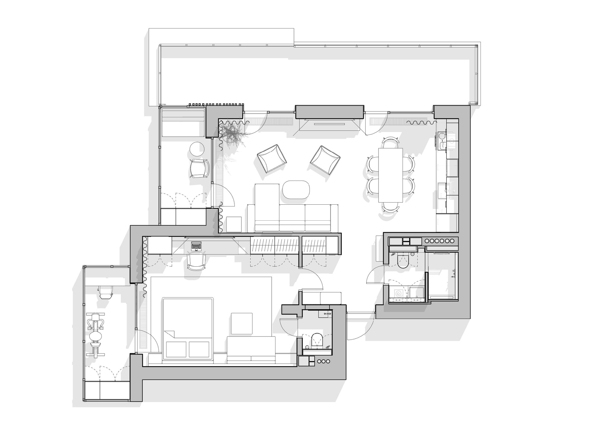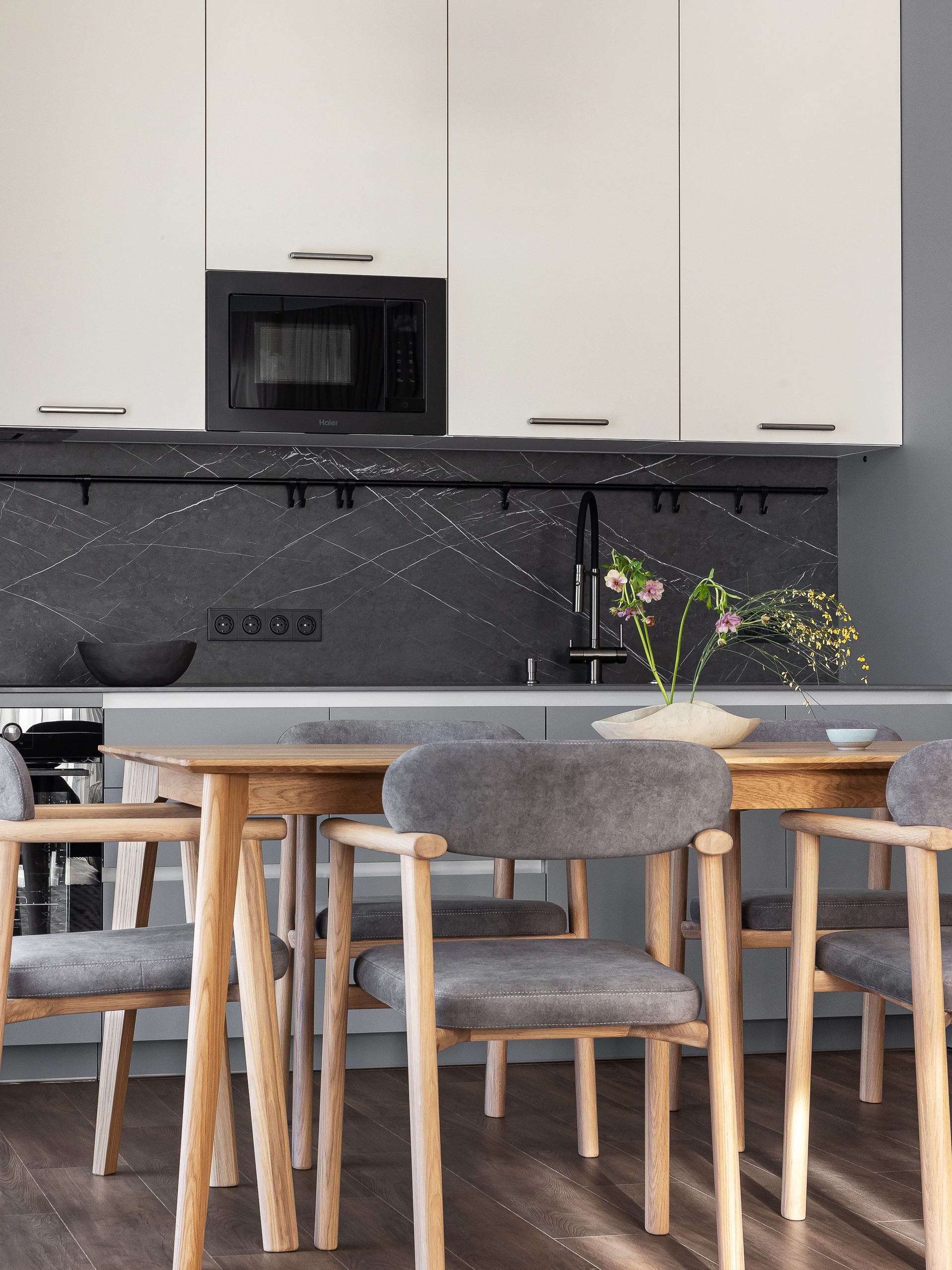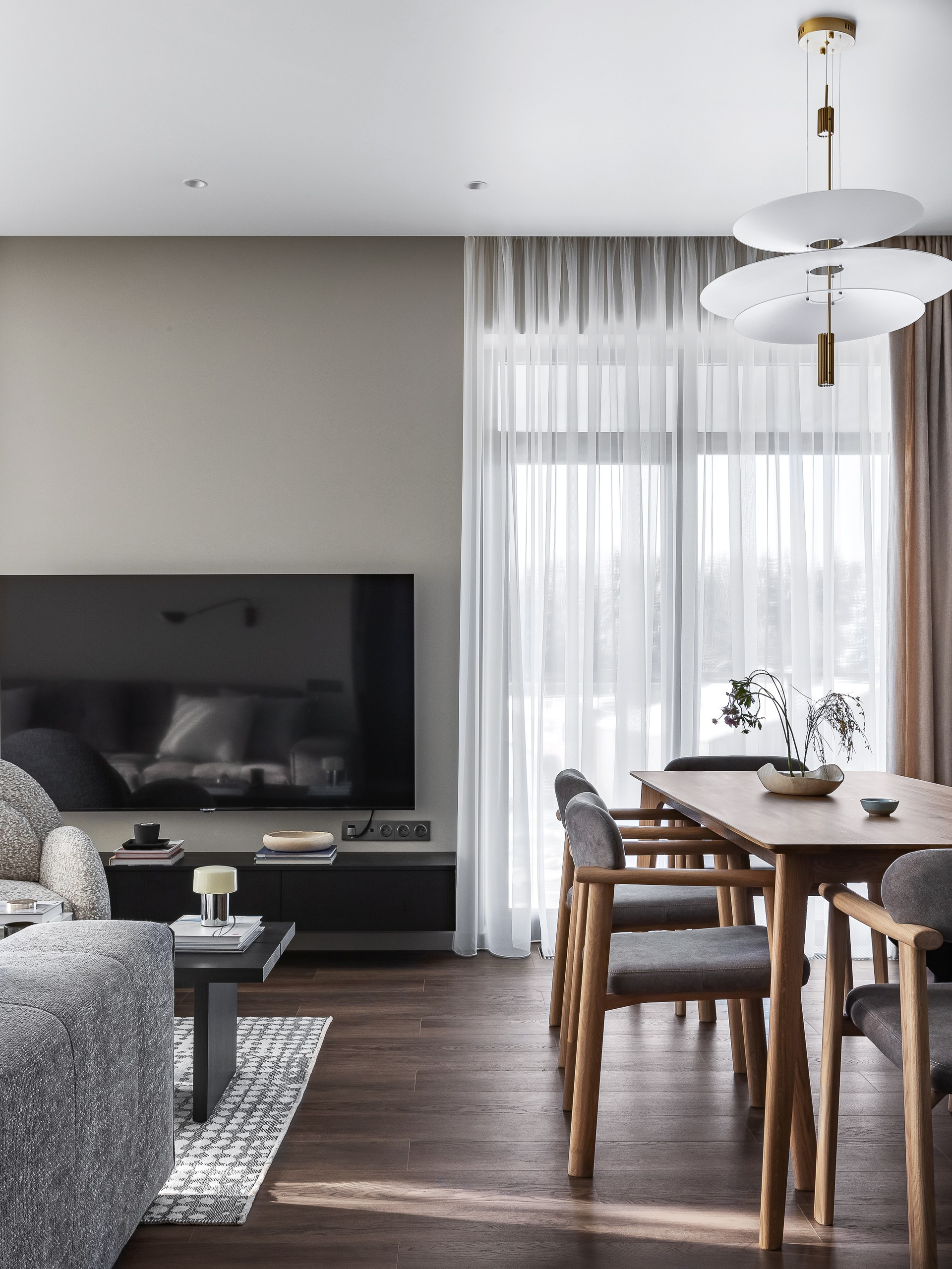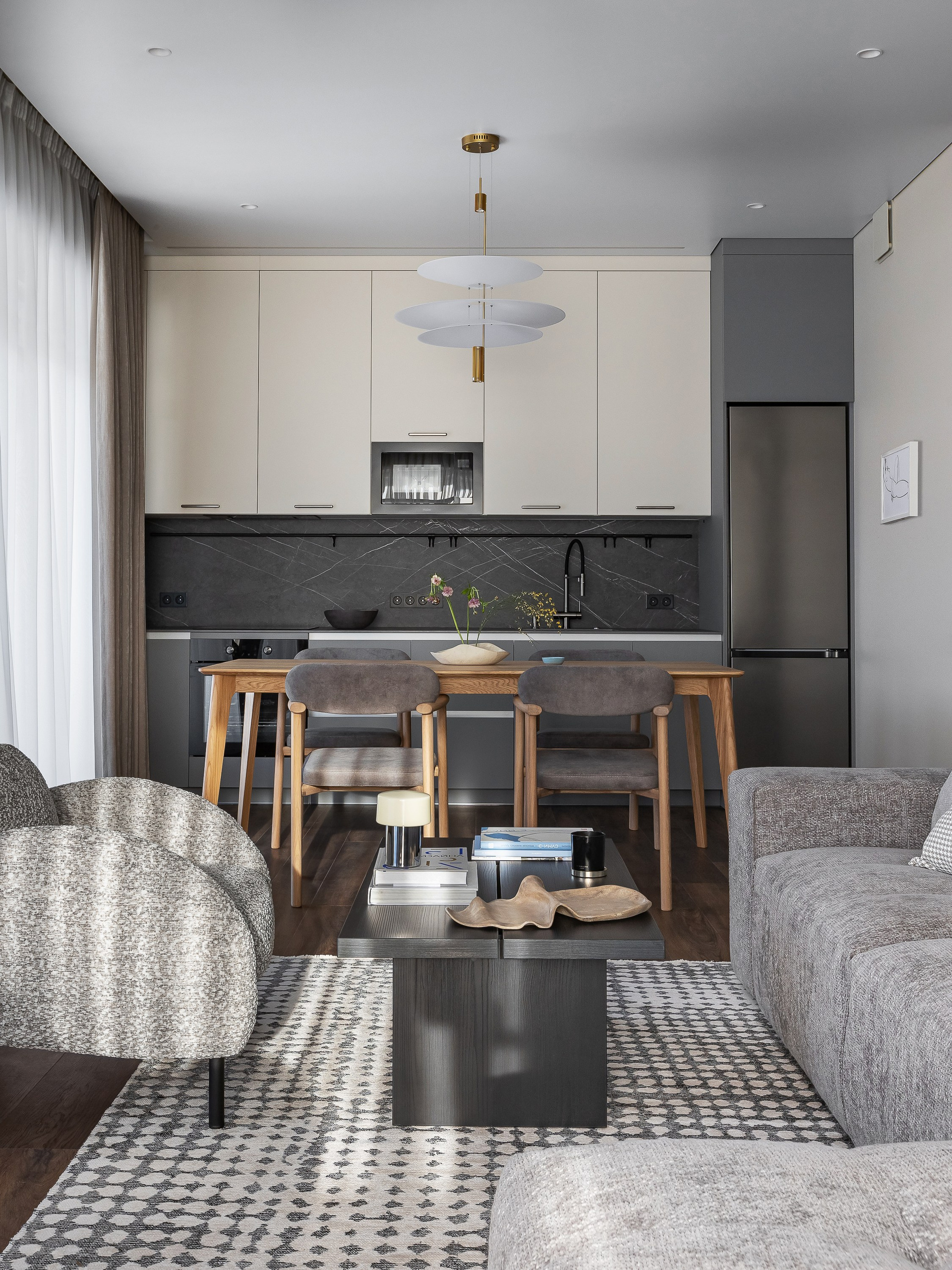 Стол из массива дерева в обеденной зоне добавляет теплоты в сдержанный интерьер и вмещает большое количество гостей.