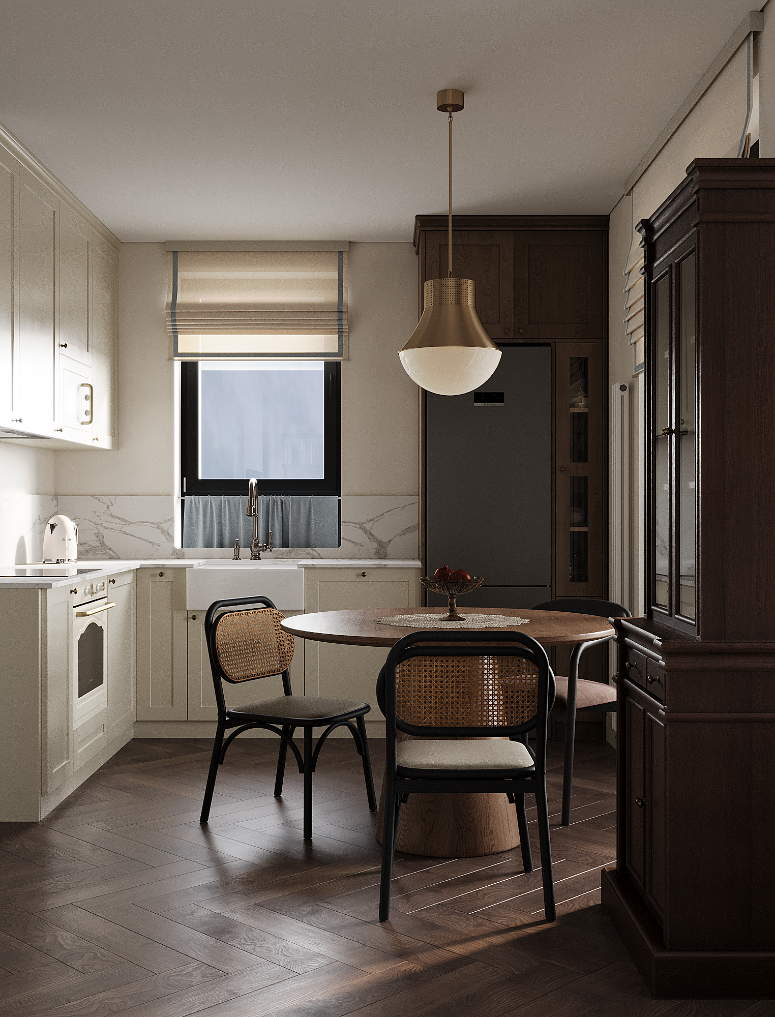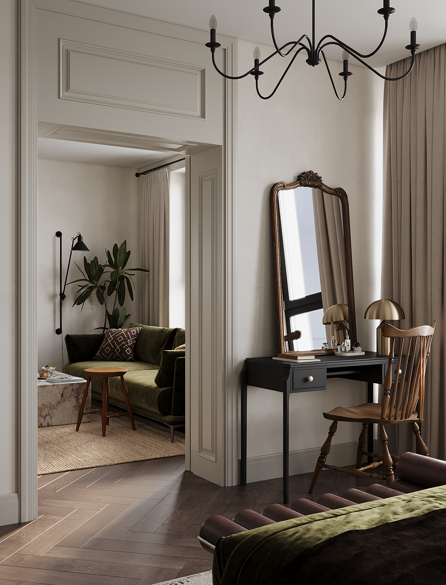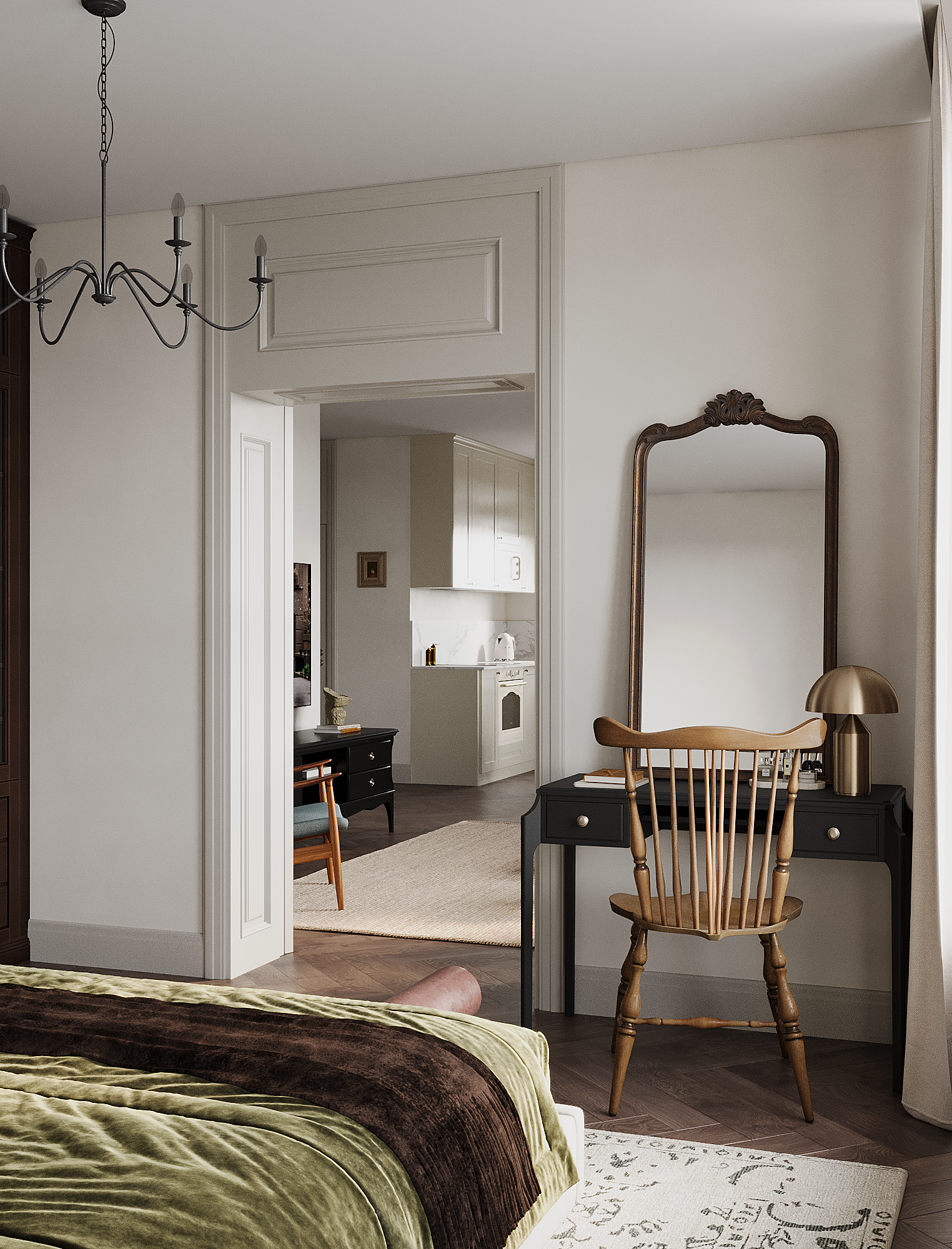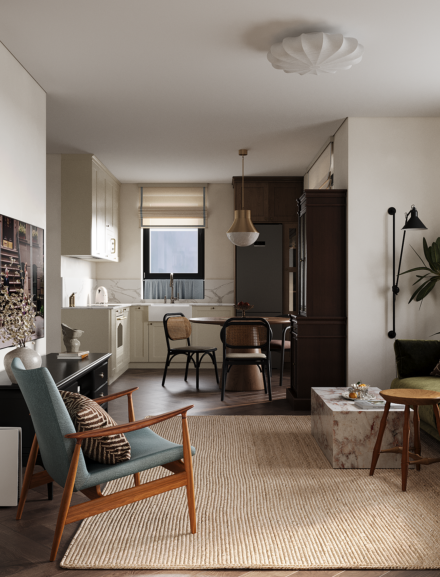 Заказчица полностью разделяет нашу стратегию распределения бюджета «не в стены, а в мебель». Важным принципом стало присутствие предметов с историей, поэтому на этапе реализации предполагается включение винтажных элементов. При этом современные изделия также подбираются из натуральных материалов и рассчитаны на долгий срок службы — их история только начинается.