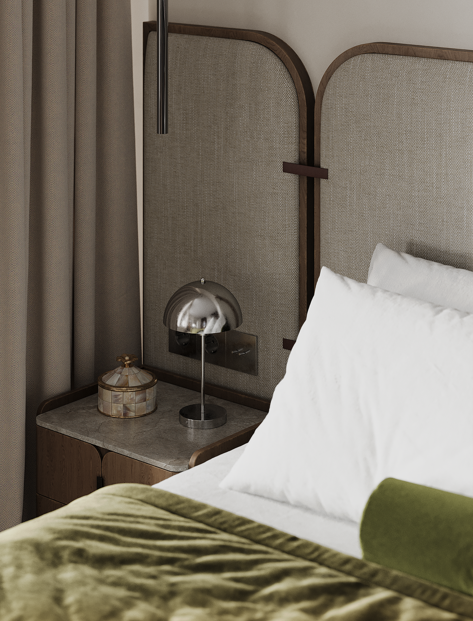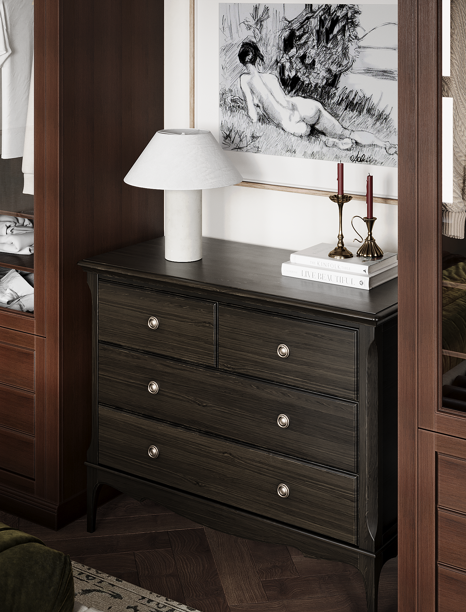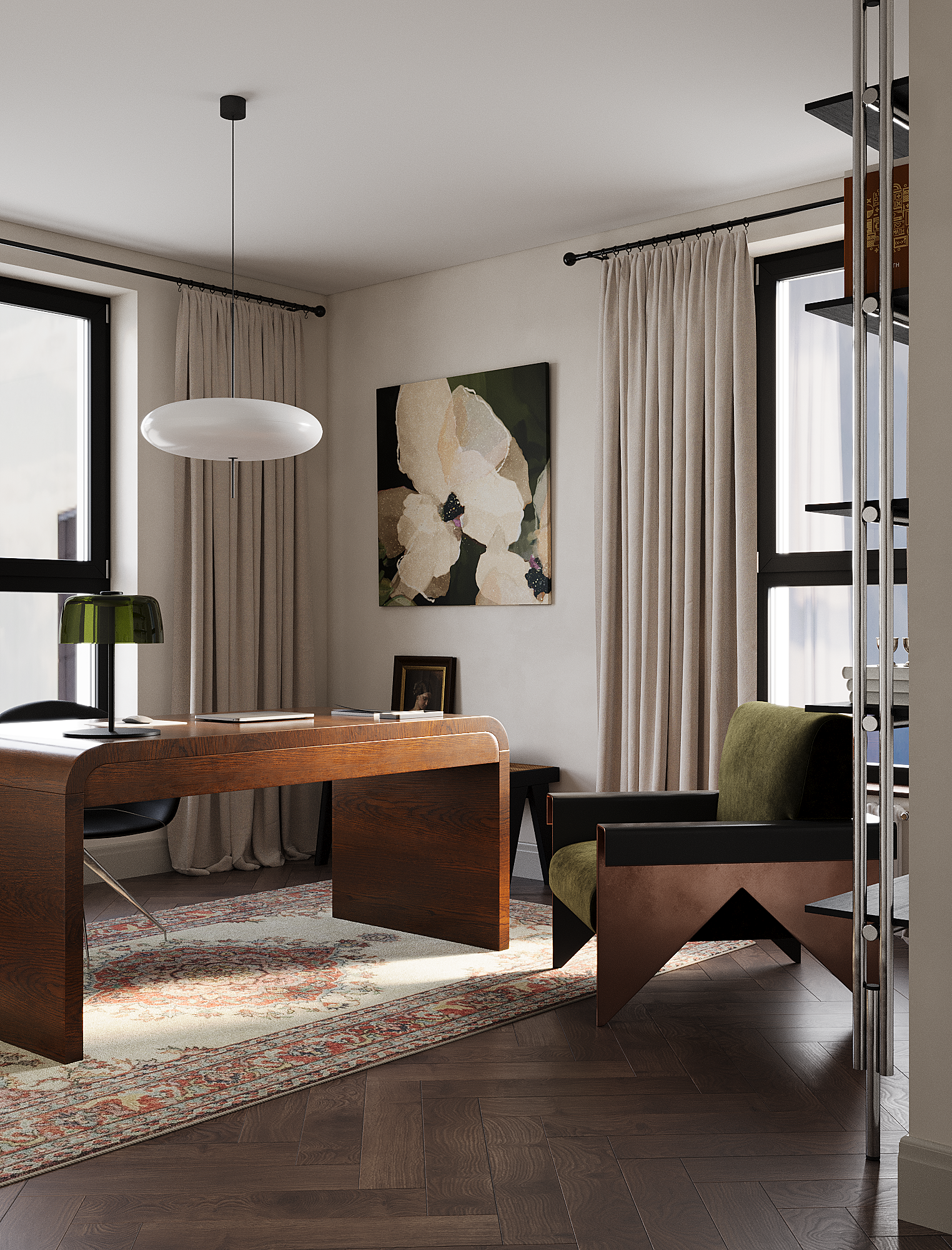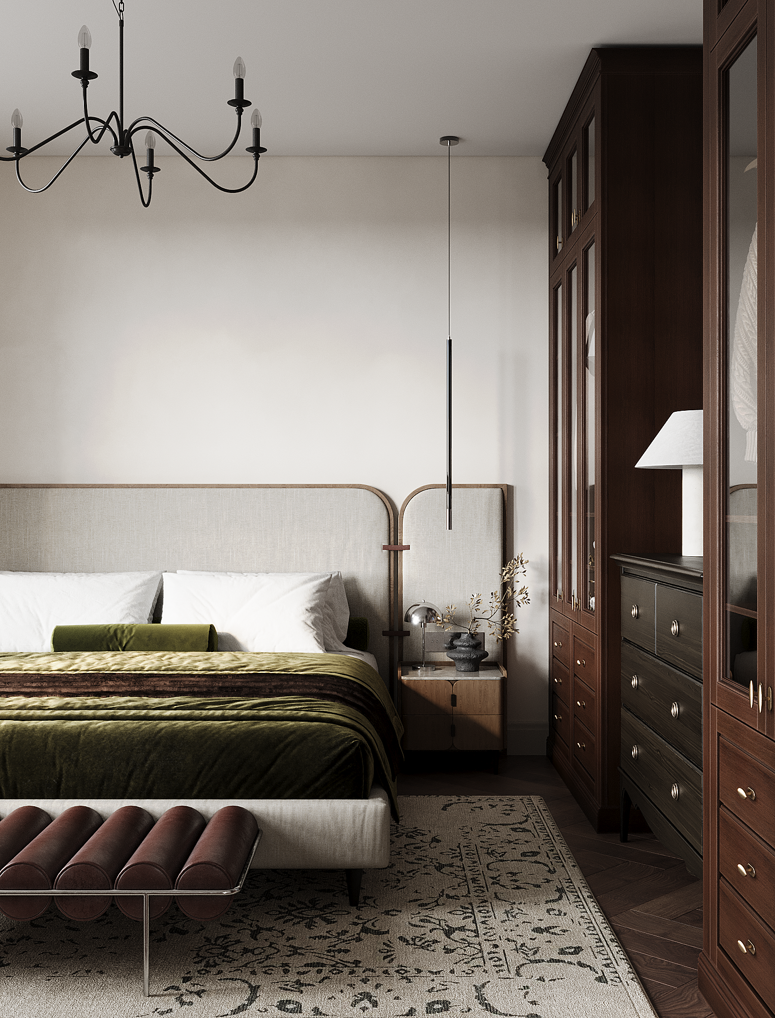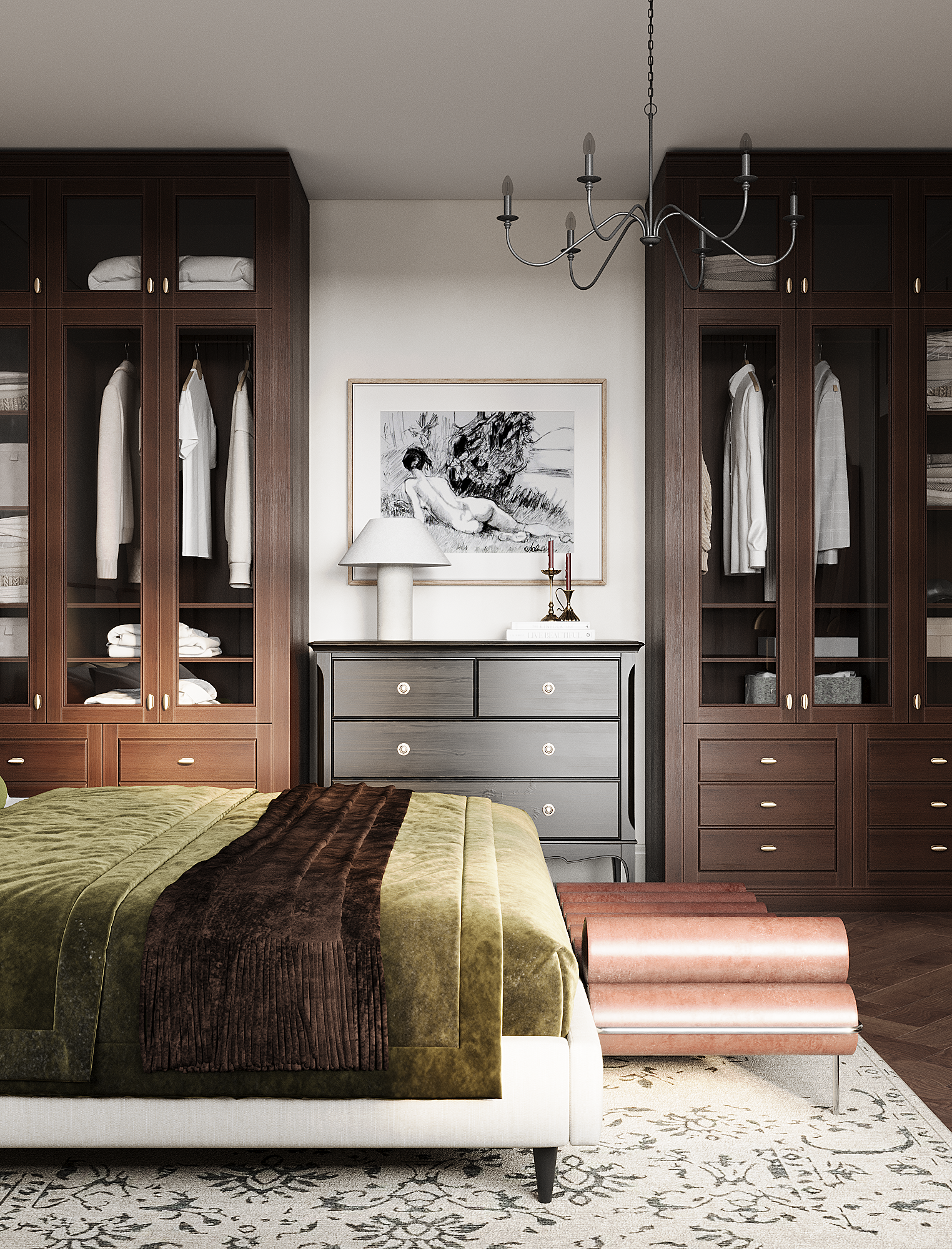 Заказчица полностью разделяет нашу стратегию распределения бюджета «не в стены, а в мебель». Важным принципом стало присутствие предметов с историей, поэтому на этапе реализации предполагается включение винтажных элементов. При этом современные изделия также подбираются из натуральных материалов и рассчитаны на долгий срок службы — их история только начинается.