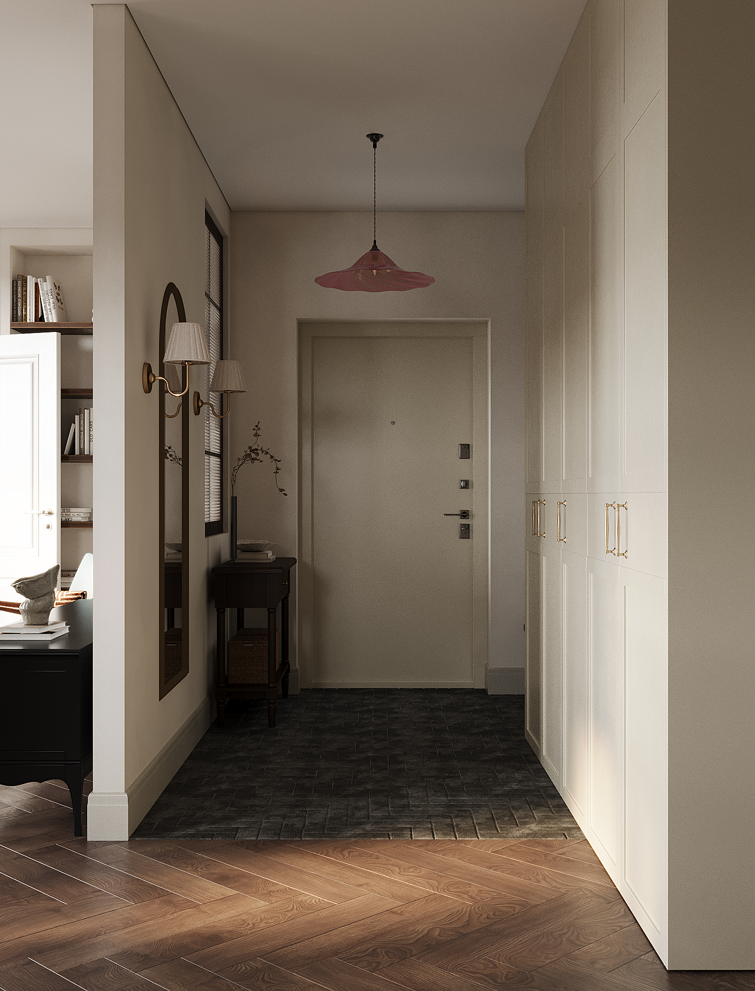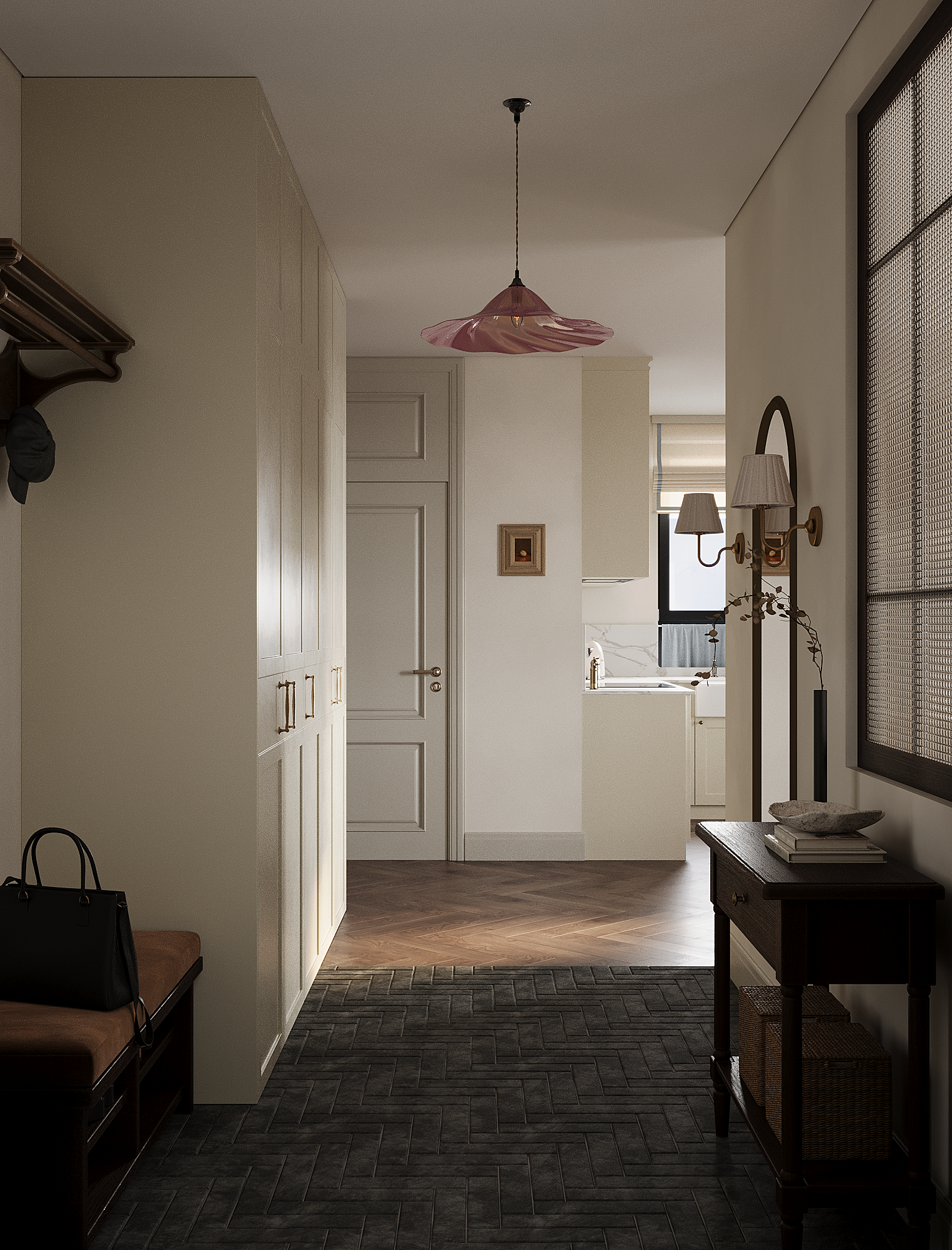 Интерьер разработан для молодой девушки. В основе концепции — её любовь к загородной эстетике, которая стала отправной точкой при создании пространства. Межкомнатное деревянное окно и брусчатка в прихожей уже с порога задают нужную атмосферу.