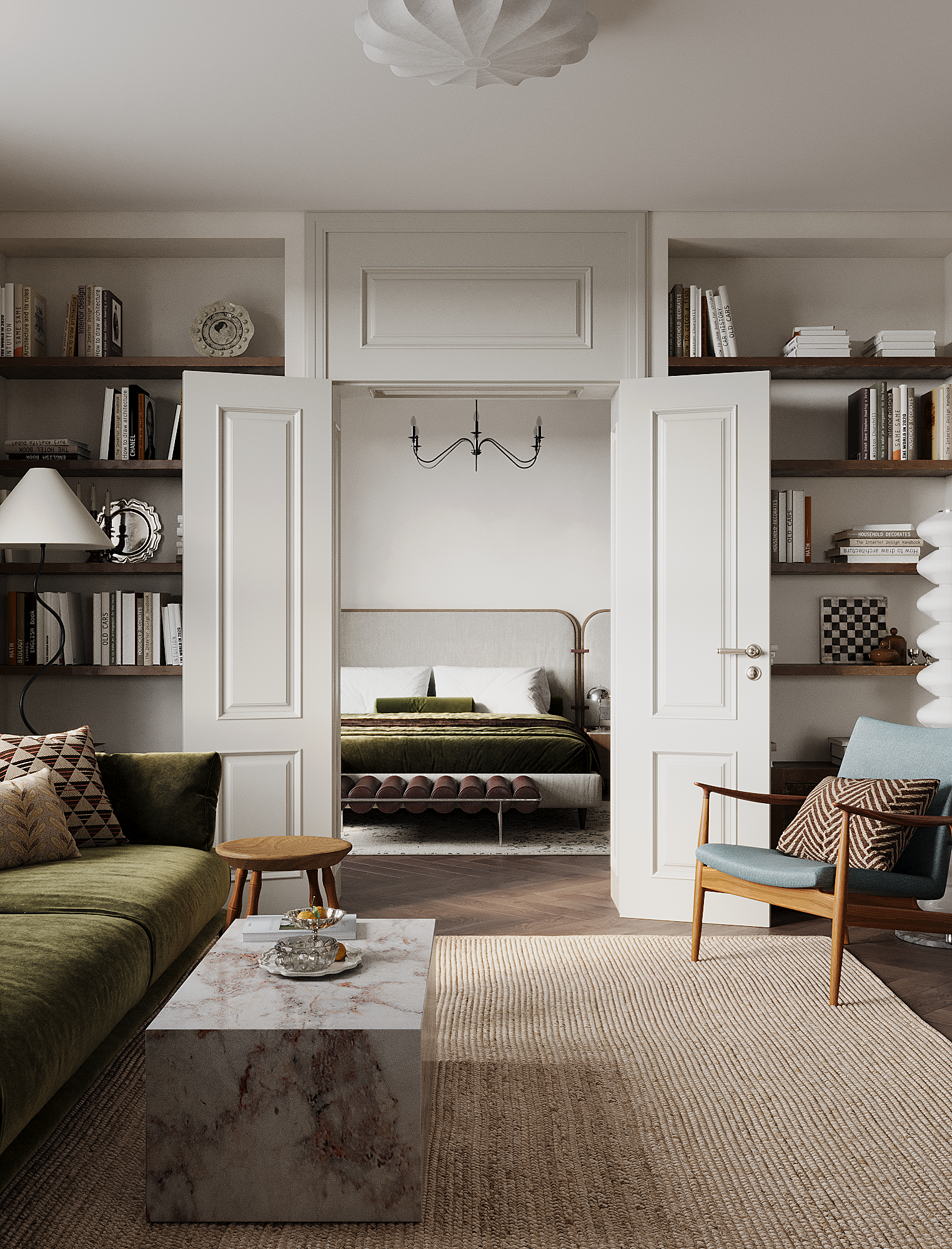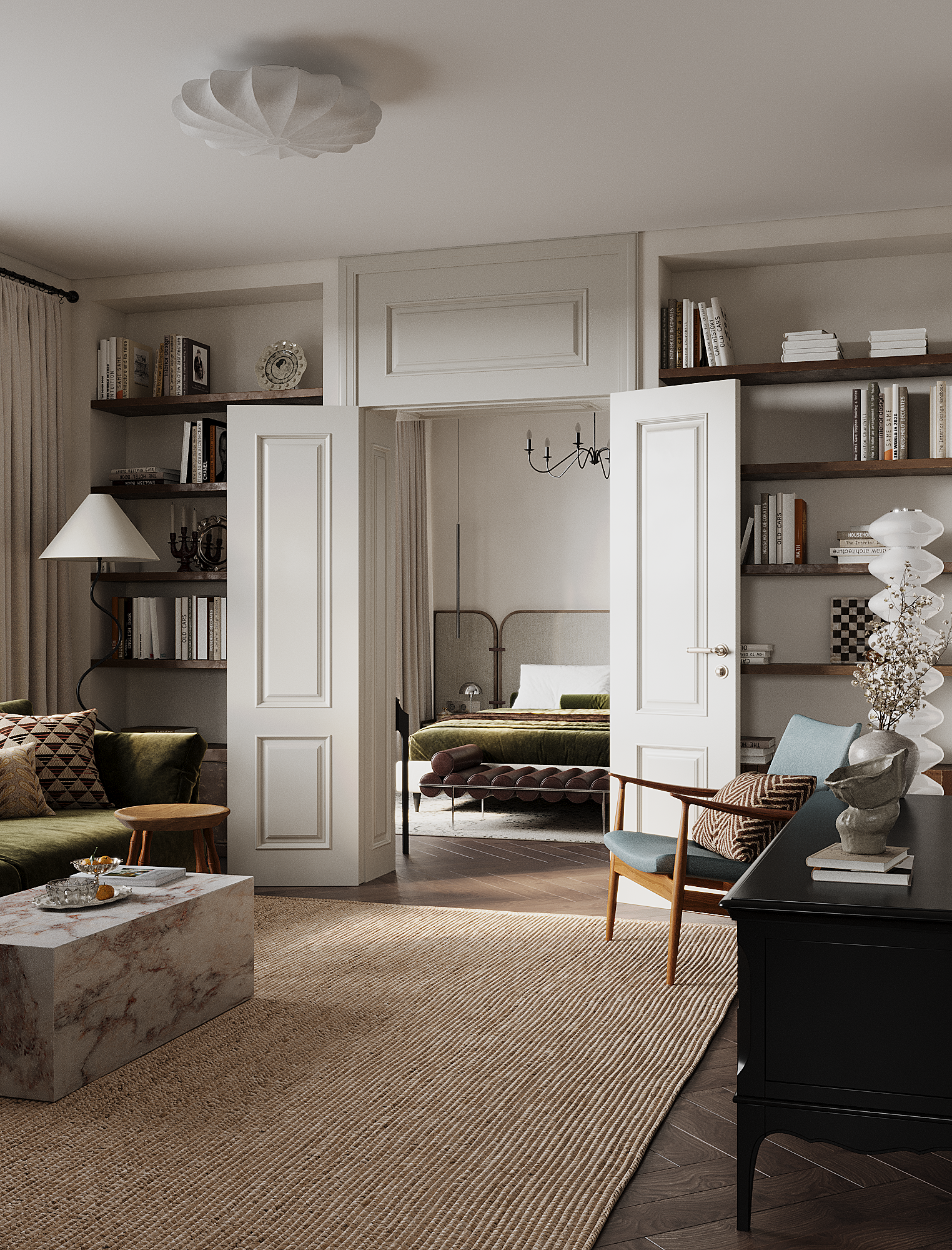 Планировочное решение можно назвать нестандартным: спальня вынесена в противоположную часть квартиры относительно изначальной задумки застройщика. Однако с учётом образа жизни, желаний и потребностей хозяйки это решение стало оптимальным. Важной задачей было сохранить визуальные перспективы по всей квартире — этому способствуют двойные двери, усиливающие глубину и связность пространства.